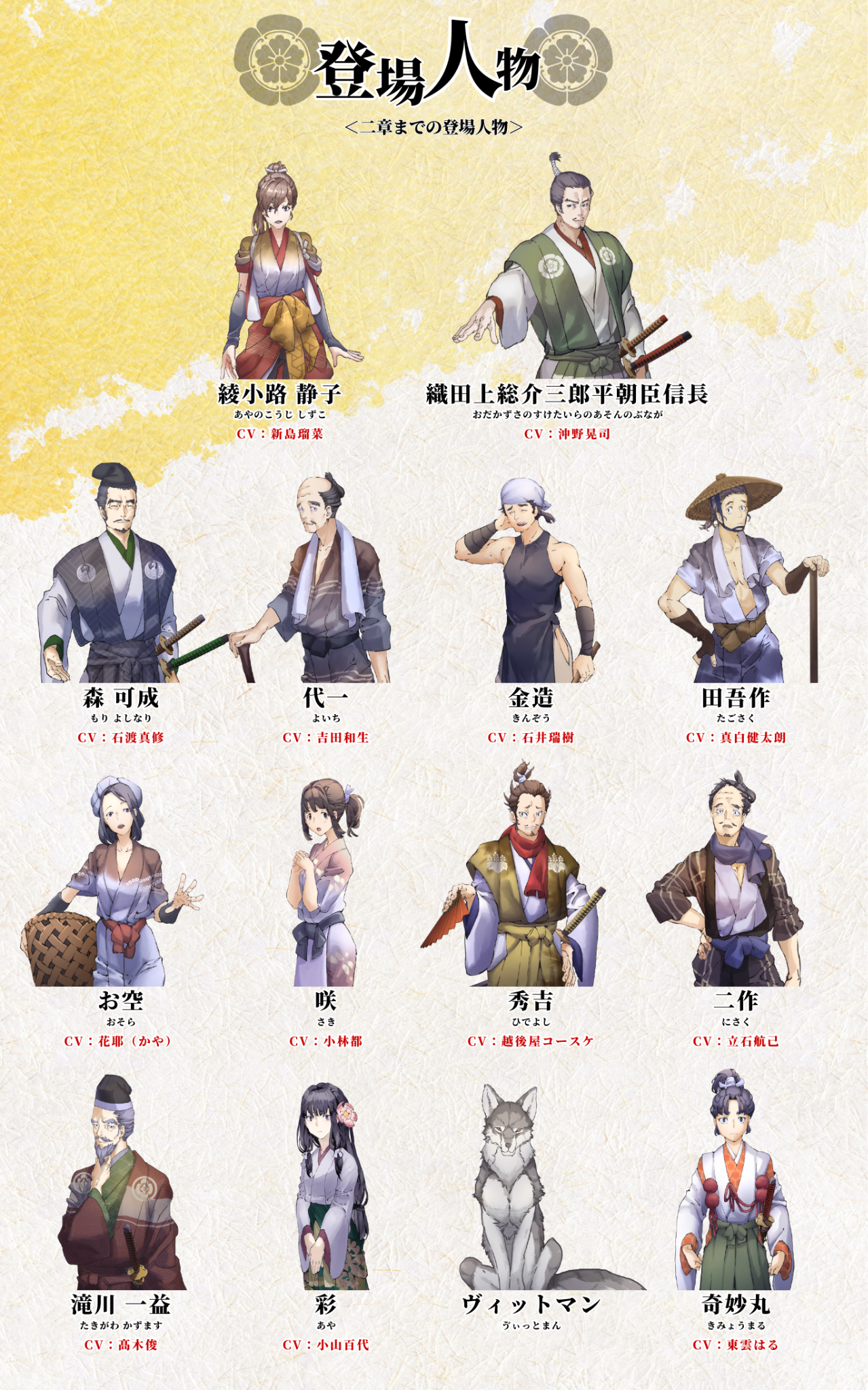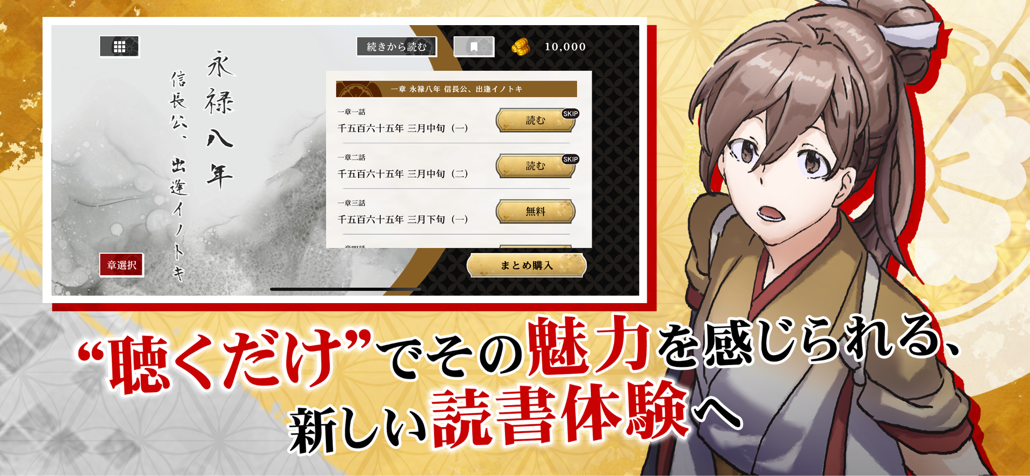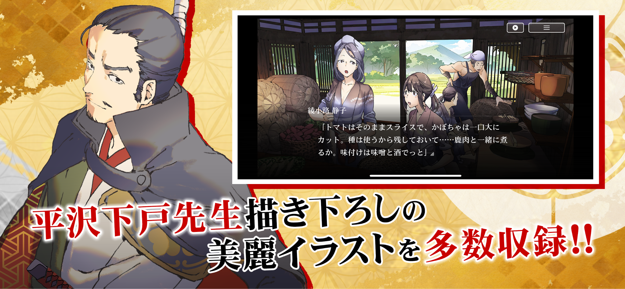本アプリは物語を1話ずつ購入して読み進めるフルボイス・ヴィジュアルノベルアプリで、第1章の第1話~第8話まで無料でお楽しみいただけます。まずはアプリを手に取り、静子とともに戦国の世界へ足を踏み入れてみてください。