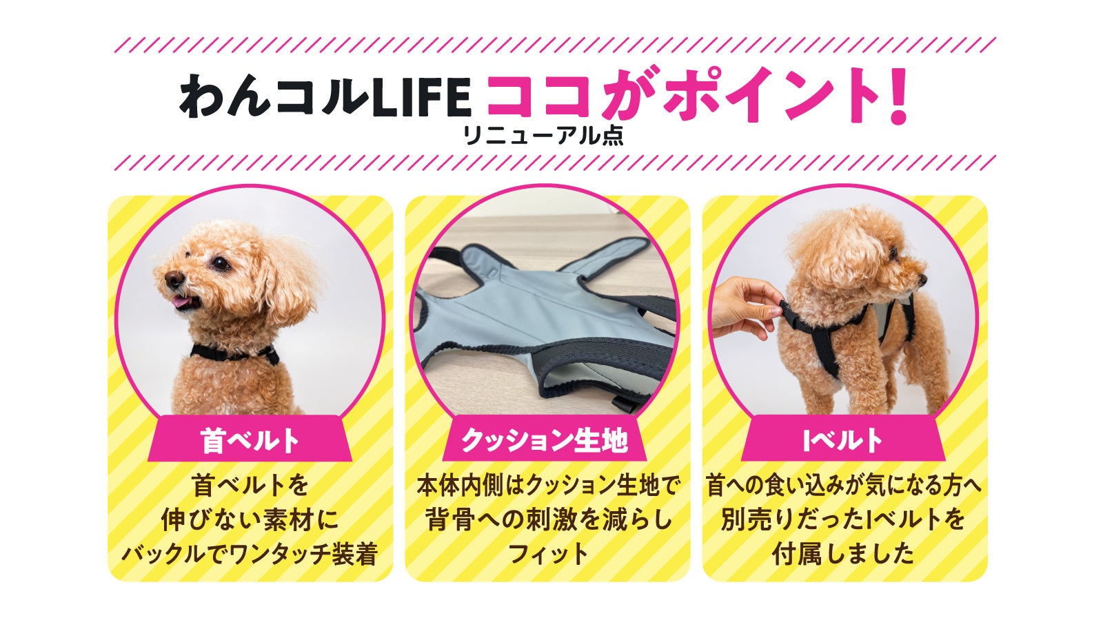 そんな飼い主さまの声に寄り添い、これからシニア期を迎えるワンちゃんにも、すでにサポートが必要なワンちゃんにも使えるアシストウェア「わんコルLIFE」が誕生しました。
