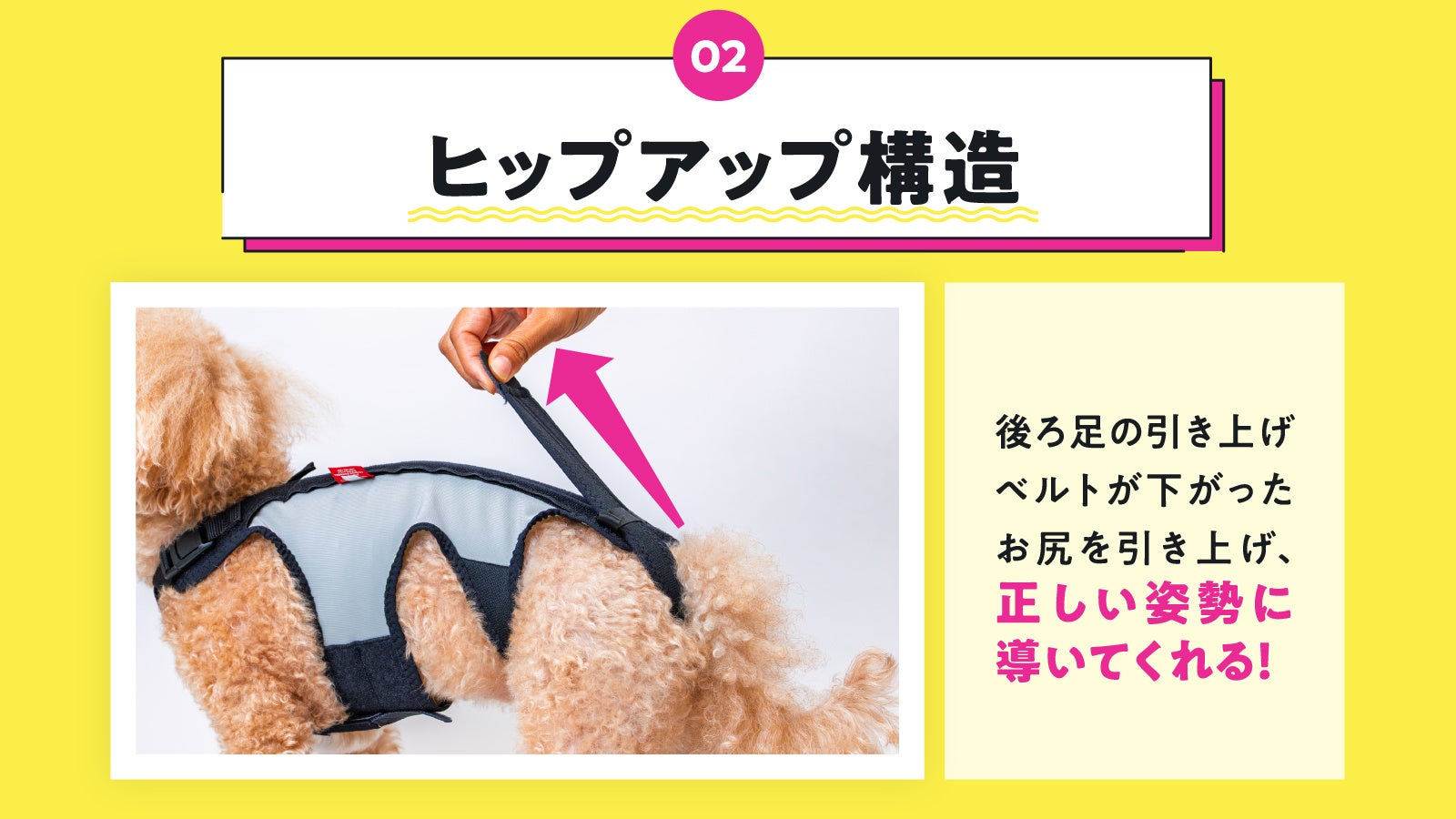 後ろ足の引き上げベルトが、下がったお尻を正しい位置に引き上げます。姿勢を整えることで、愛犬の健康的な動きをサポートします。