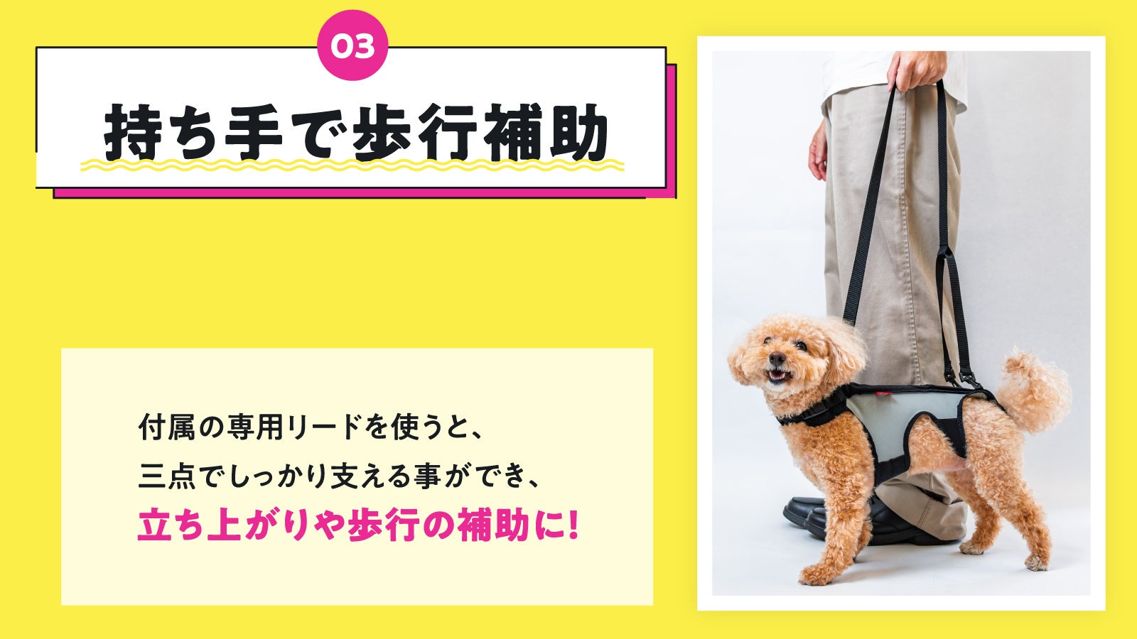 付属の専用リードを使用すると、首とお尻(左右)の3点でしっかり愛犬を支えられます。立ち上がりや歩行の補助となり、飼い主さまの身長に合わせて持ち手の長さも調整可能です。
