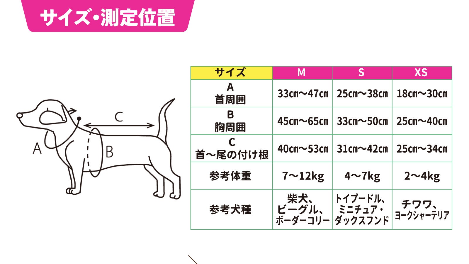 サイズ:M(参考犬種:柴犬、ビーグル、ボーダーコリー)S(参考犬種:トイプードル、ミニチュア・ダックスフンド)