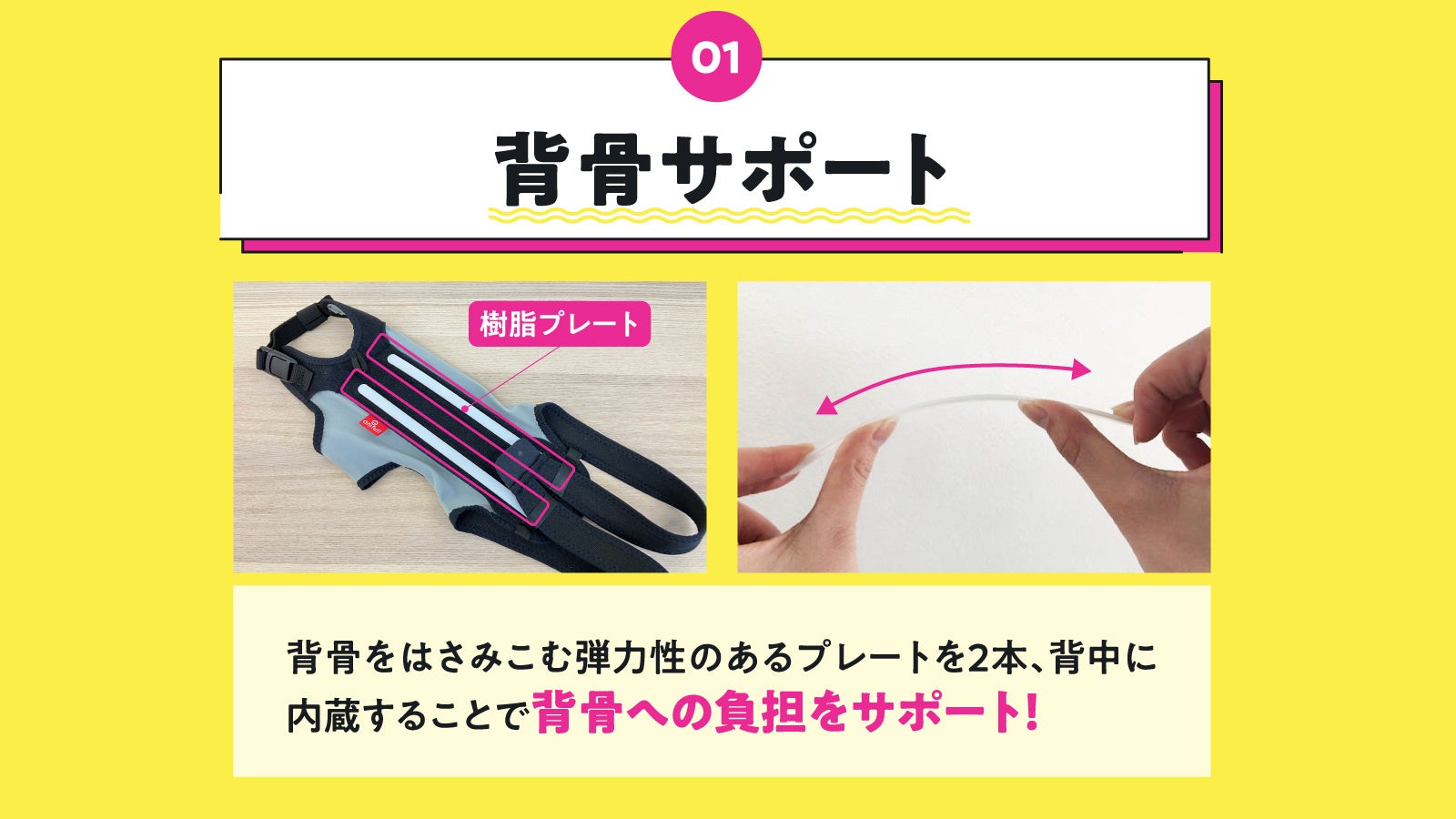 弾力性のあるプレート2本を背中に内蔵し、背骨を挟み込むことで、シニア犬の背骨にかかる負担をサポートします。