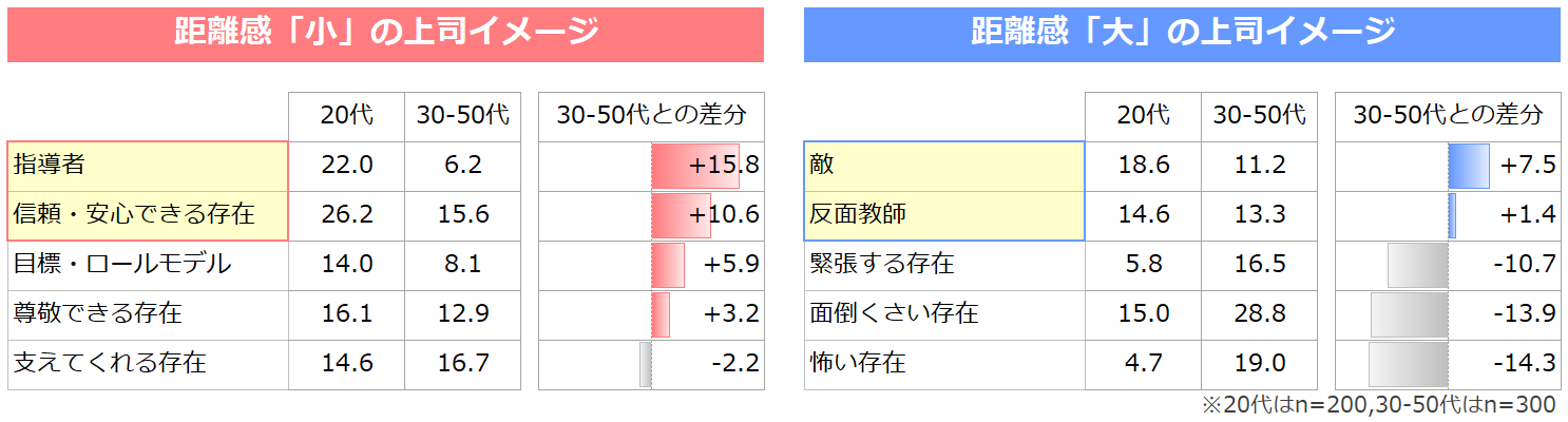 「距離感小」を求めるZ世代は、「指導者(+15.8pt)」「信頼・安心できる存在(+10.6pt)」といったポジティブな上司像を描いています。一方で、「距離感大」を求めるZ世代では、「敵(+7.5pt)」「反面教師(+1.4pt)」といった否定的な印象が強く表れています。