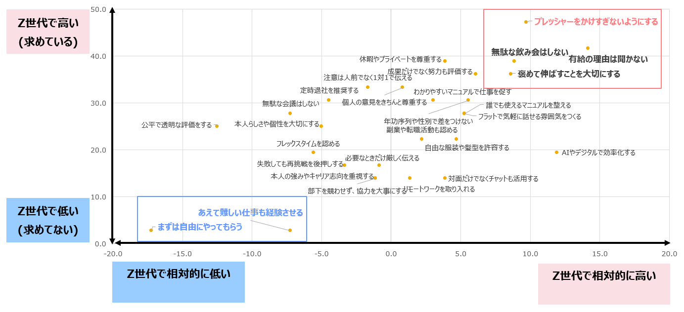 右上に位置する施策ほど「Z世代が求めているが、上司世代が実践できていないマネジメント」、左下に位置するものほど「Z世代は求めていないが、上司世代がやりがちなマネジメント」であることを示しています。