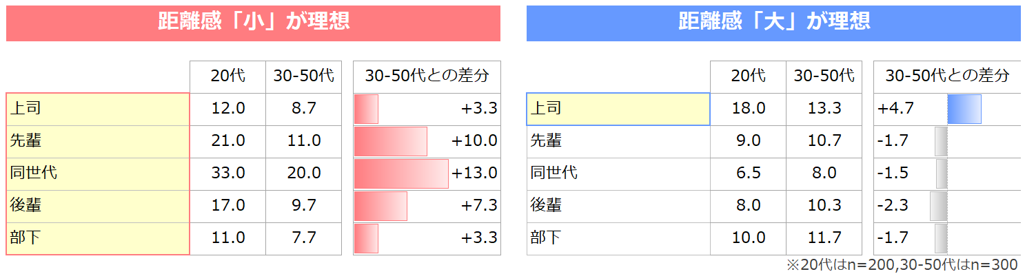 「距離感小」または「距離感大」を求める上司のイメージ差を、世代間で比較しています。