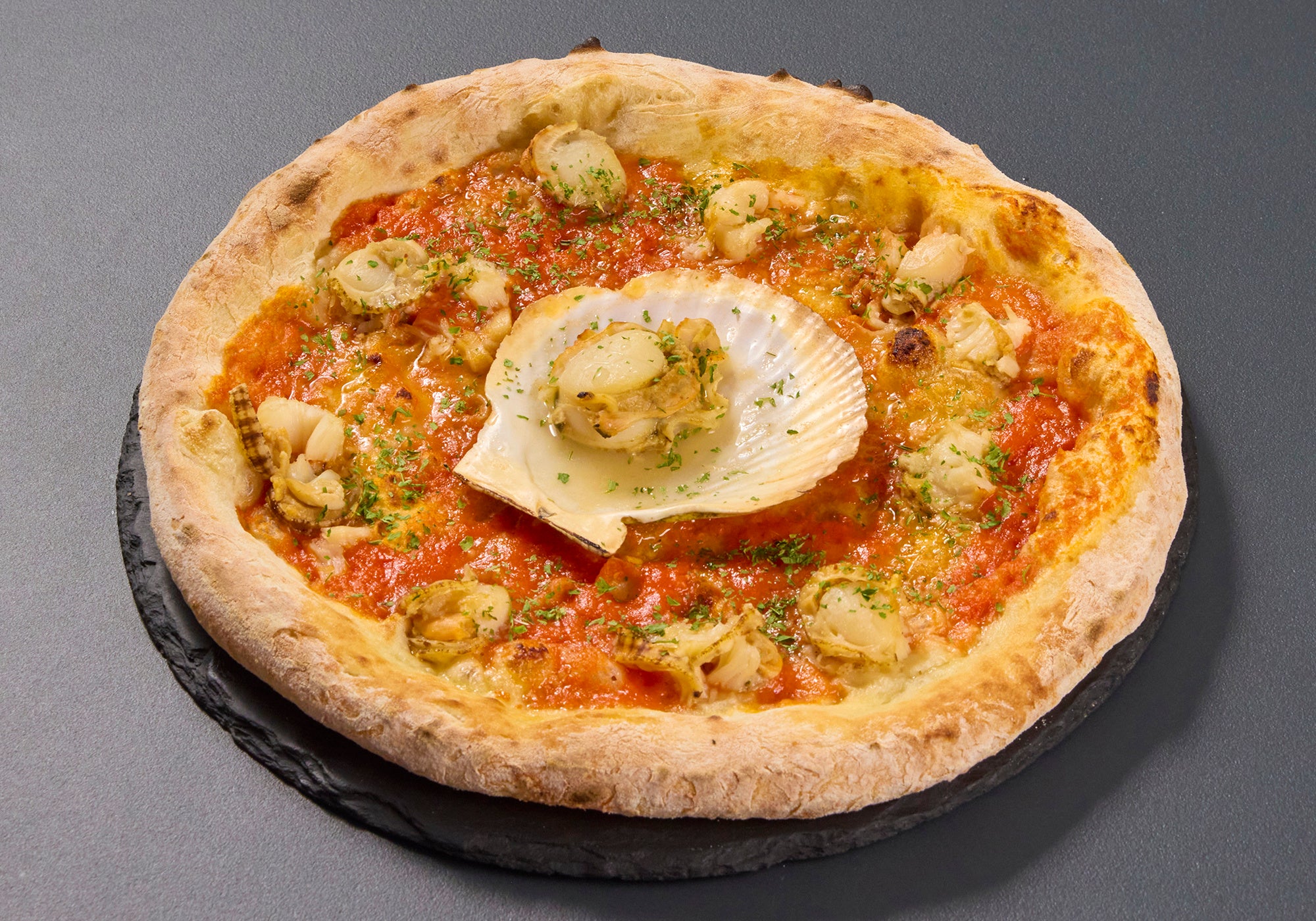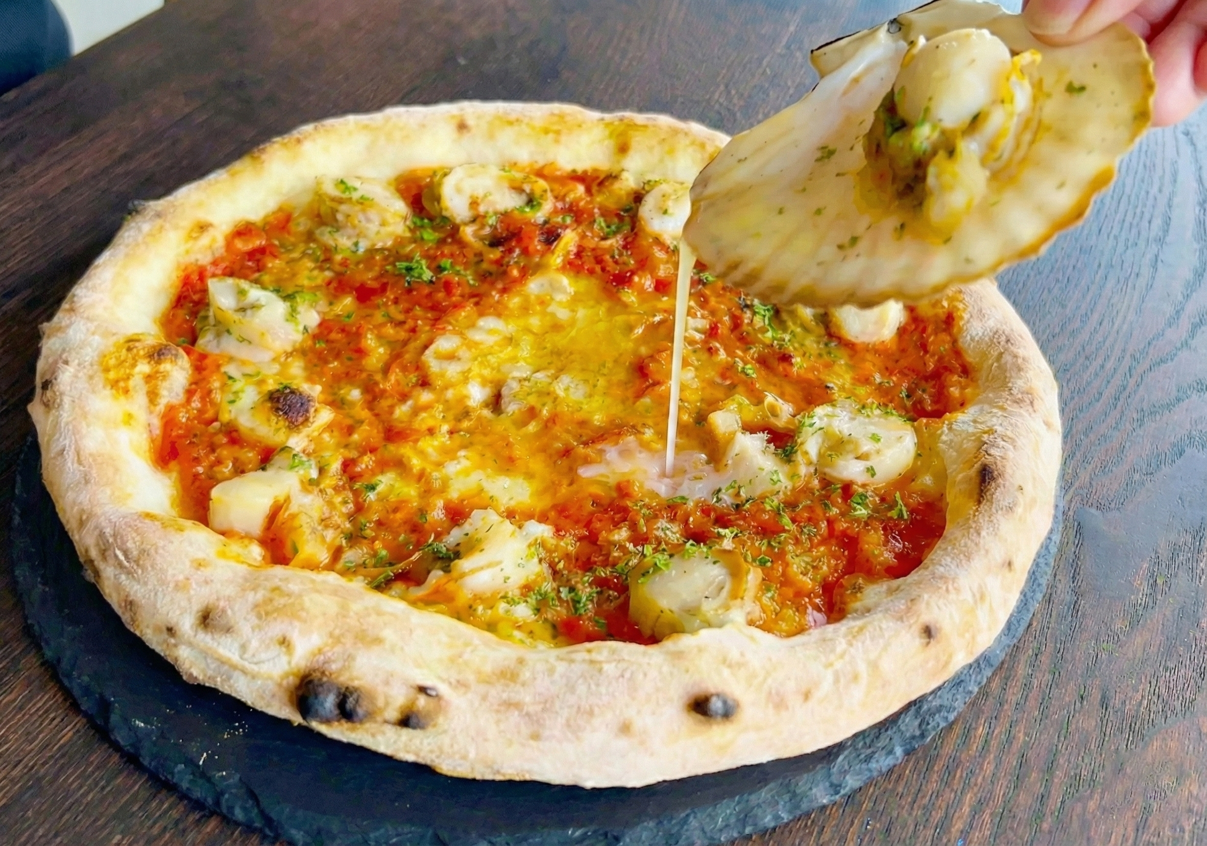 殻のダシをまわしかけて仕上げる「北海道産ホタテのピザ」