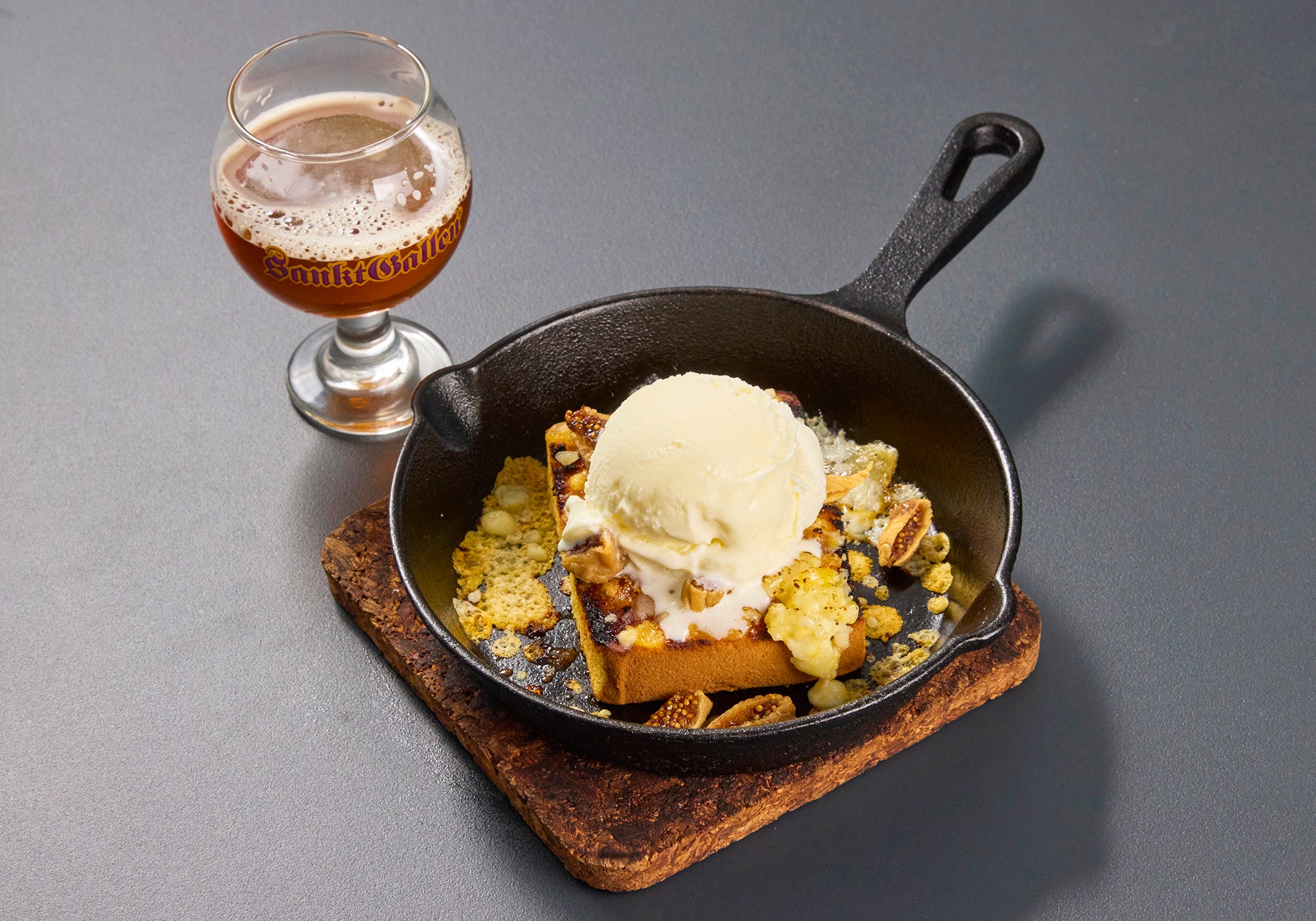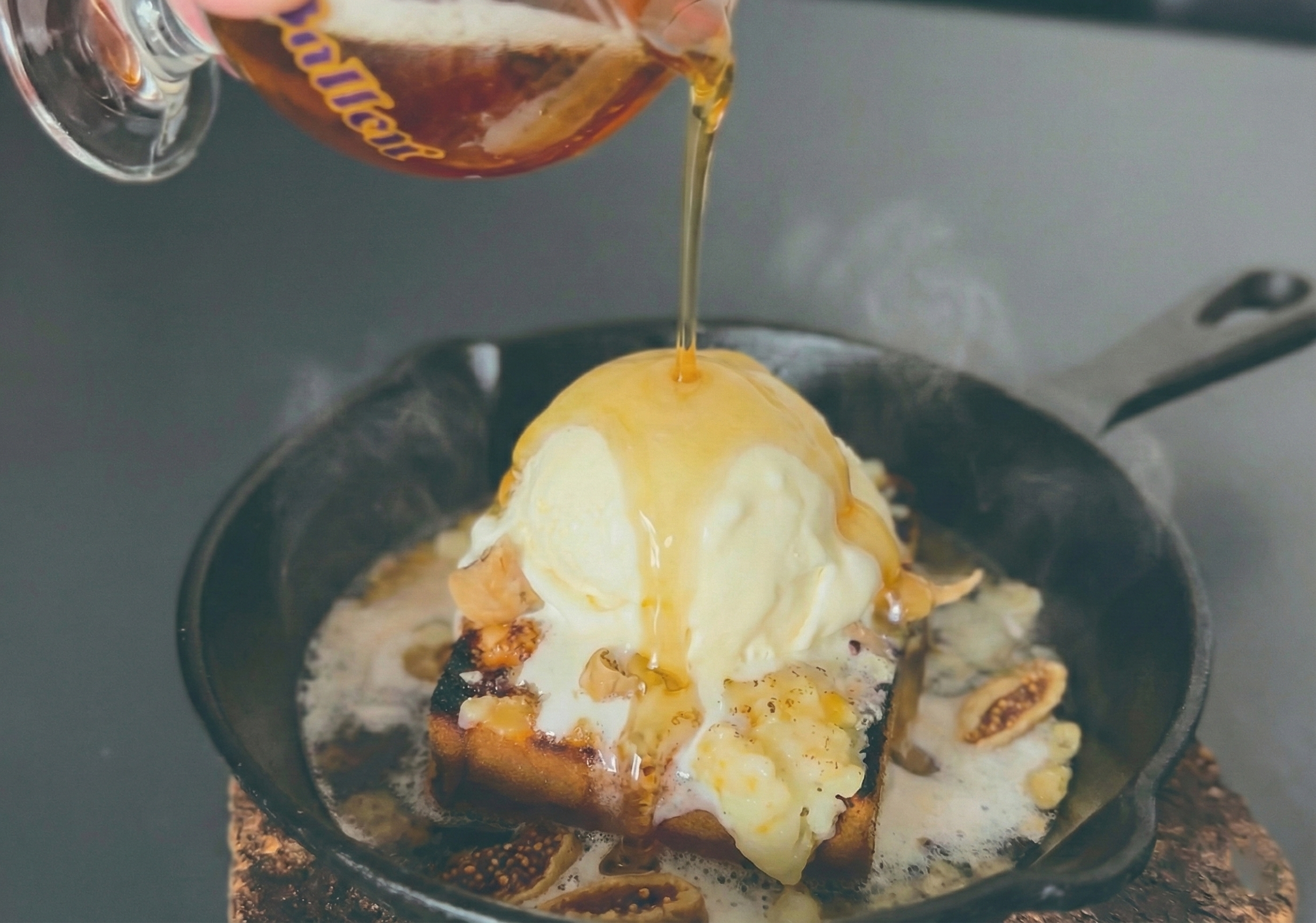 バニラアイスの下には卵カステラ、ドライいちじく、チーズを忍ばせ、チーズの塩味が全体を引き締めます。小麦のワインを注ぐとバニラアイスがとろけ、その甘みと香りをカステラがじんわり吸い込み、深い余韻のスイーツに変わります。