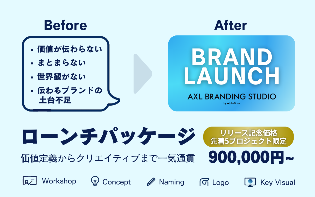 「AXL BRANDING STUDIO」のリリースを記念し、ブランド立ち上げ期に必要な要素を一式そろえた”ローンチパッケージ”を先着5社限定でリリース記念価格にて提供します。