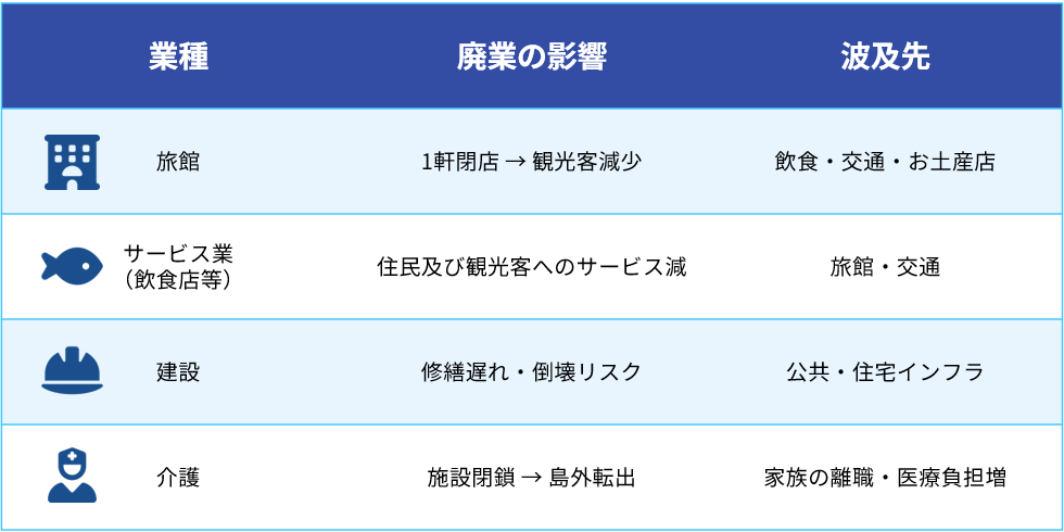 事業者が減少すると、その影響は一社・一店舗にとどまりません。日本提携支援では、旅館、飲食店などのサービス業、建設、病院・介護といった身近な産業を例に、廃業が地域にもたらす波及を整理しています。例えば、1軒の旅館が閉まることで観光客が減少し、飲食・交通・お土産店の売上にも影響が及びます。修繕を担う建設業者が減れば、住宅や公共インフラの維持に遅れやリスクが生じます。病院・介護施設が閉鎖すれば、市外への通院や家族の離職、医療負担の増加につながりかねません。働く場所やサービスを受ける場所が減ることは、結果として地域外への通勤や移住を後押ししてしまいます。
