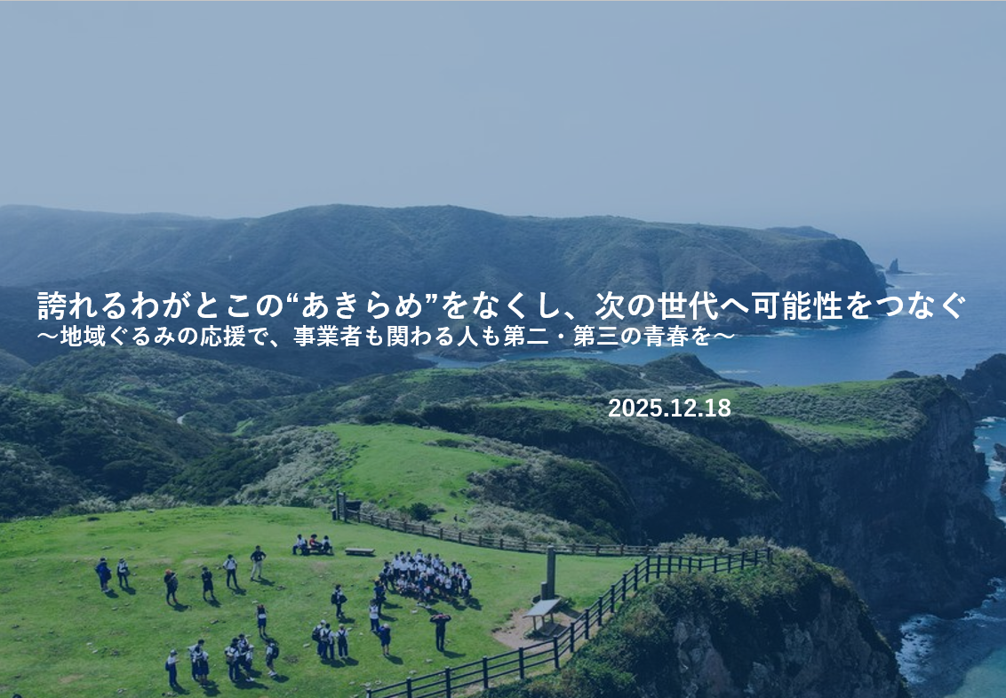 株式会社日本提携支援(本社:東京都中央区日本橋堀留町、代表取締役:大野駿介、以下「日本提携支援」)は、西ノ島町(島根県隠岐郡)と連携し、事業承継と人手不足の課題解決をテーマとしたセミナー「誇れるわがとこの“あきらめ”をなくし、次の世代へ可能性をつなぐ ~地域ぐるみの応援で、事業者も関わる人も第二・第三の青春を~」を西ノ島町役場 大会議室にて開催いたします。