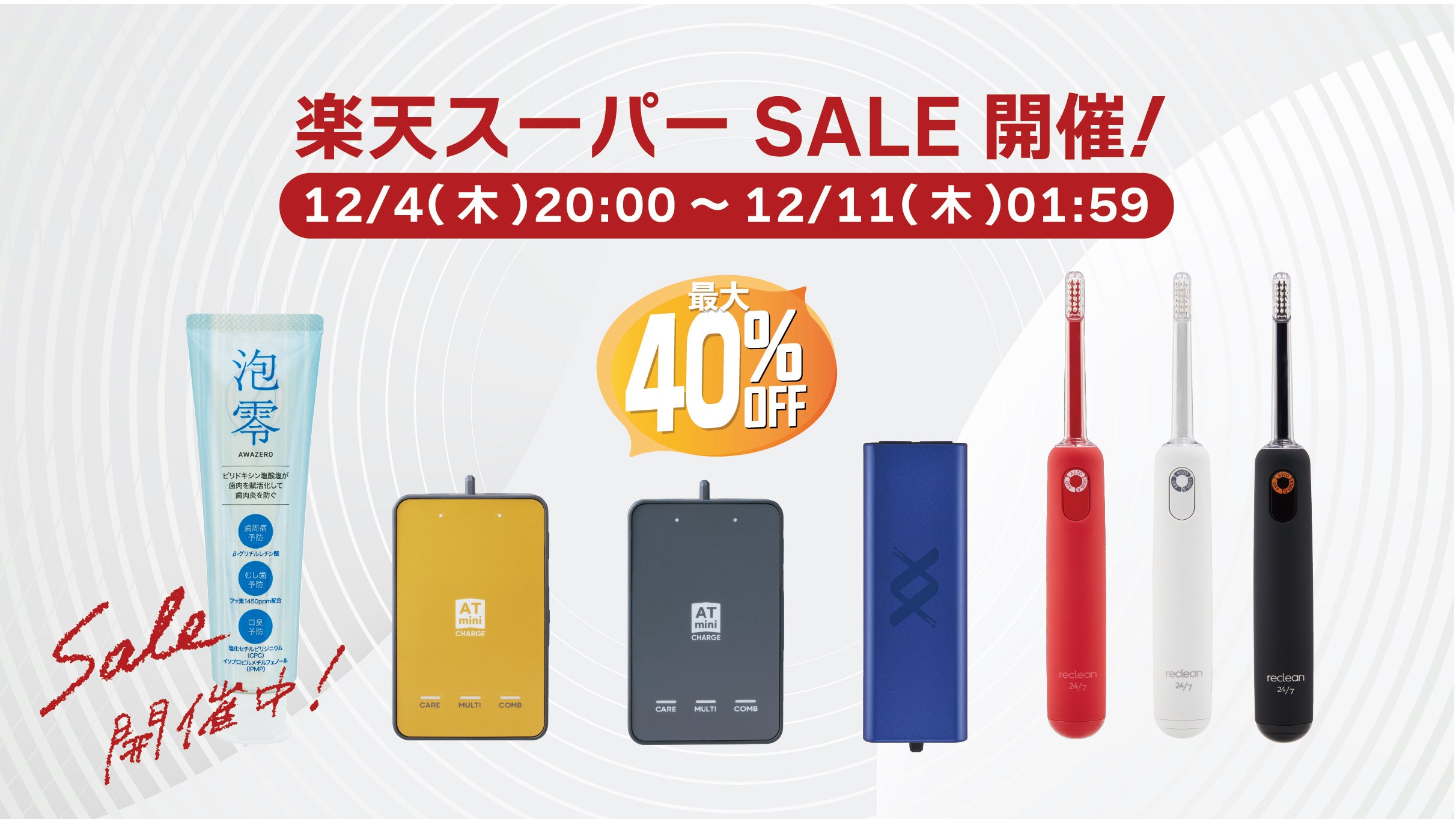 楽天スーパーセール期間中は、トップアスリートが愛用する「ATmini CHARGE」「RUCOE RUN」、超音波と音波のダブルパワー搭載の「reclean24/7」、泡立たない新感覚歯磨きジェル「泡零〈awazero〉」を通常価格から最大40%OFFでお買い求めいただけます。この機会にぜひご利用ください。