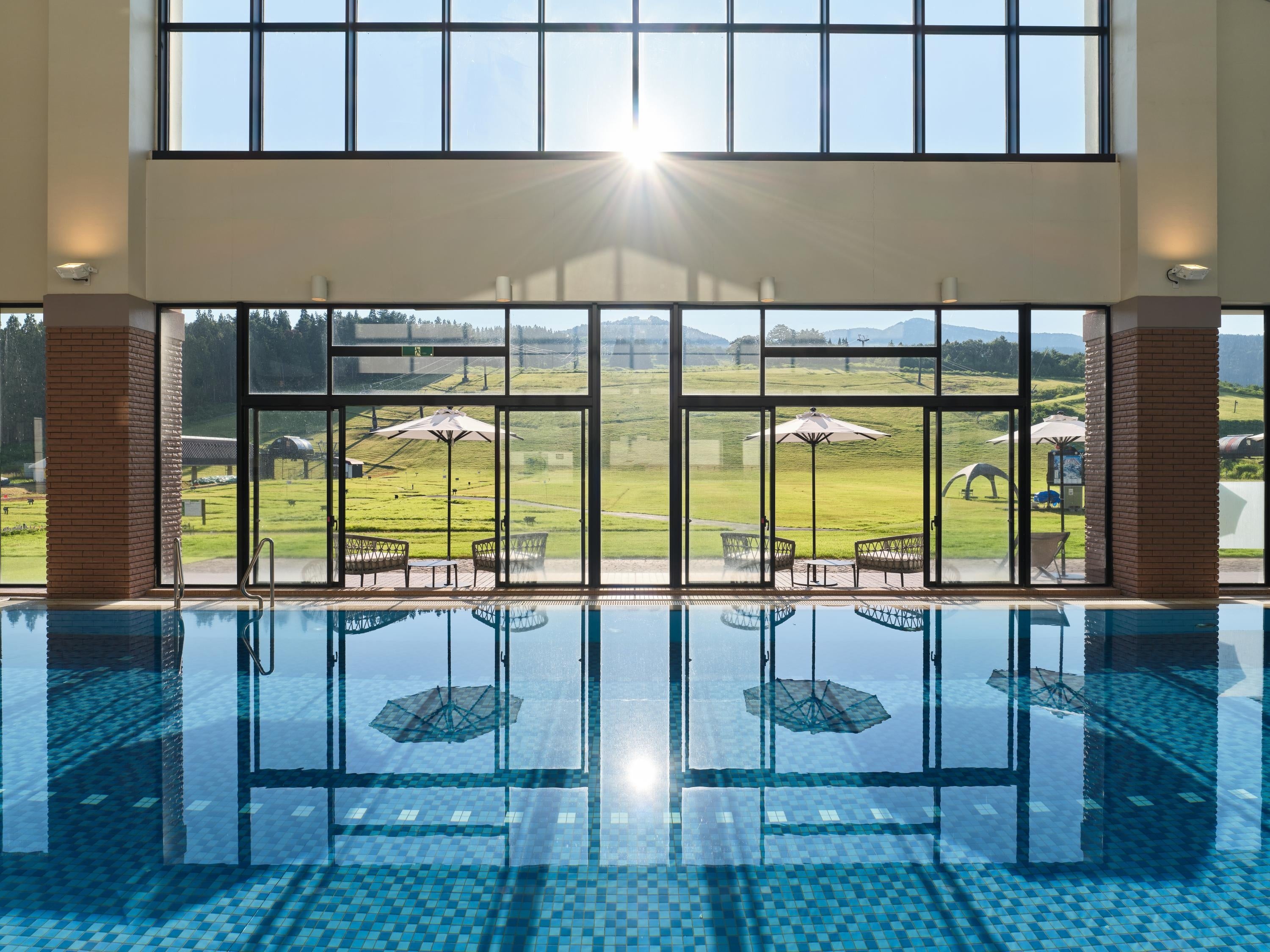 また、ホテル館内でも、夕日を望む温泉施設や、ゲレンデが目の前に広がる屋内プールをご利用いただけます。温泉の泉質は、美肌効果の高い含硫黄 ナトリウム 塩化物炭酸水素塩泉(中性等張性温泉)。疲れを癒しながら、しっとり潤う肌を実感でき、多くの女性ゲストから好評です。また、屋内プールは大きな窓で開放感あふれる仕様で、サマーベッドも完備。ビタミンウォーターを飲みながら、リゾートならではのリラックスタイムをお楽しみいただけます。
