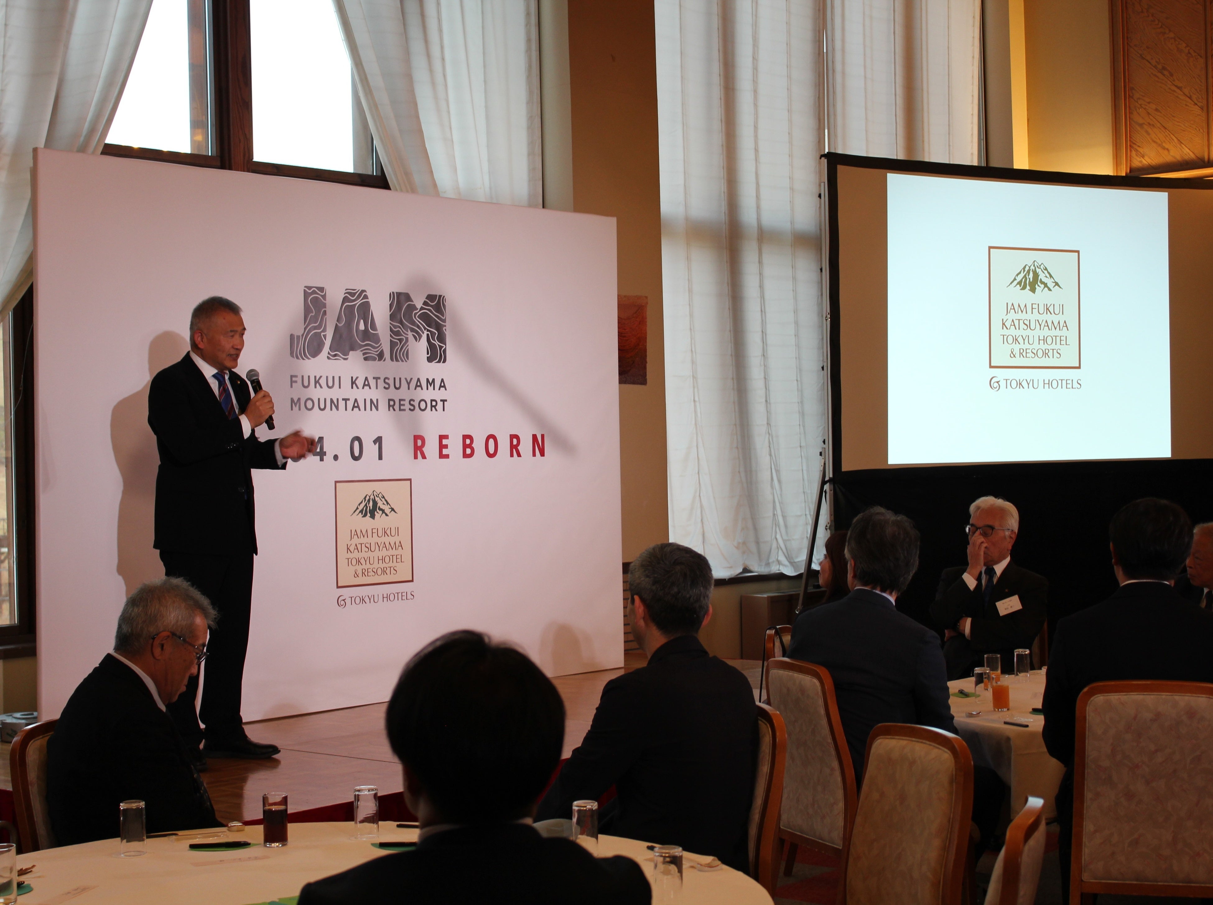 2025年12月3日、スキージャム勝山では毎年恒例のスキー場安全祈願祭とあわせて「リブランド記念パーティー」を開催しました。勝山高原開発株式会社 代表取締役社長 齋藤聡による挨拶に続き、取締役山内絢人や東急ホテルズ&リゾーツ株式会社 山下有一執行役員がリブランドに向けた意気込みを説明。さらに、ご来賓の水上実喜夫 勝山市長からも、これからのJAMに期待することについて、激励メッセージをいただきました。