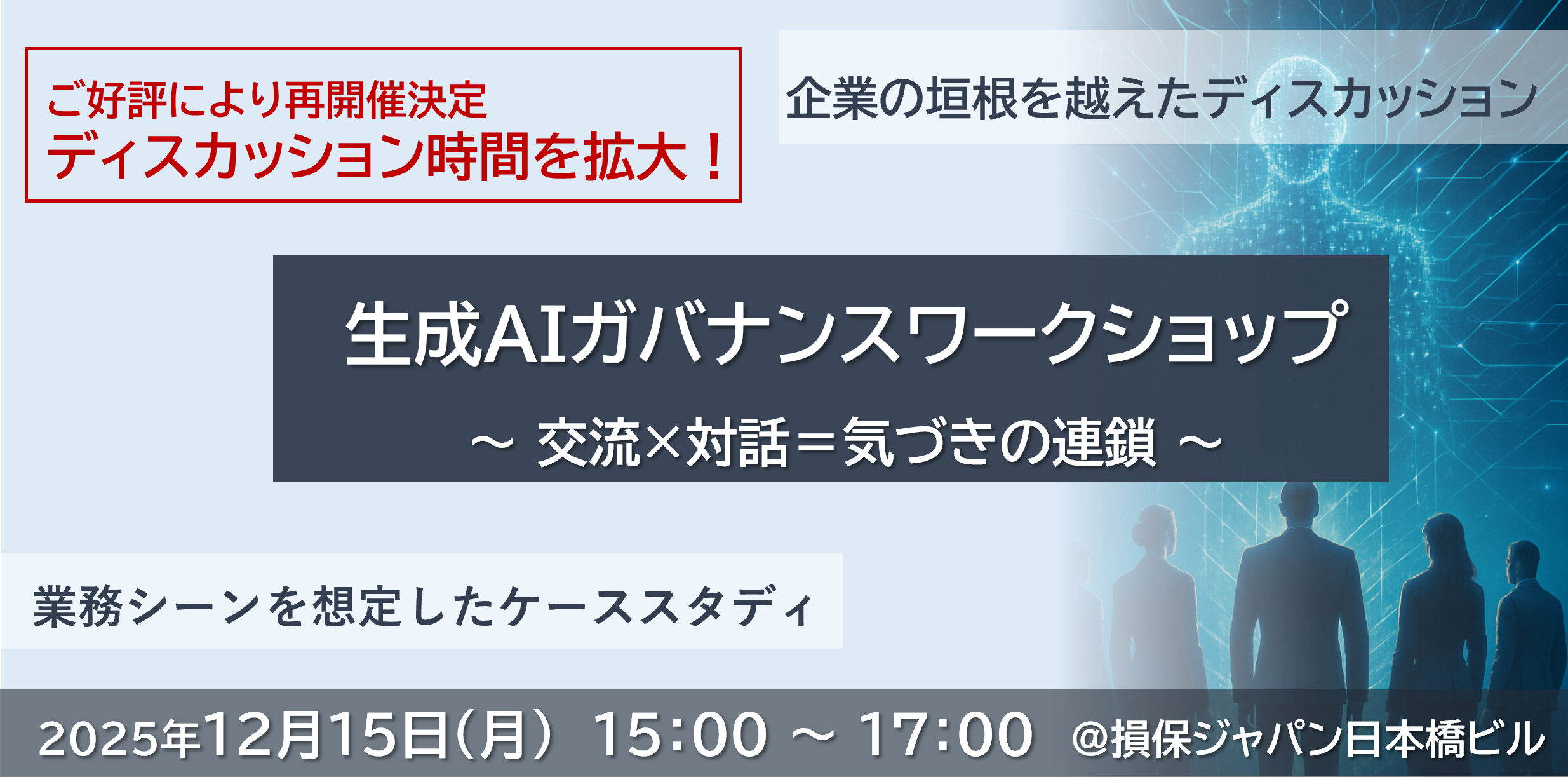 企業の多種多様なリスクマネジメント・コンサルティングサービスを提供するSOMPOリスクマネジメント株式会社は、前回2025年6月に開催しご好評いただいた「生成AIガバナンスワークショップ」を2025年12月15日(月)に再開催することをお知らせいたします。
