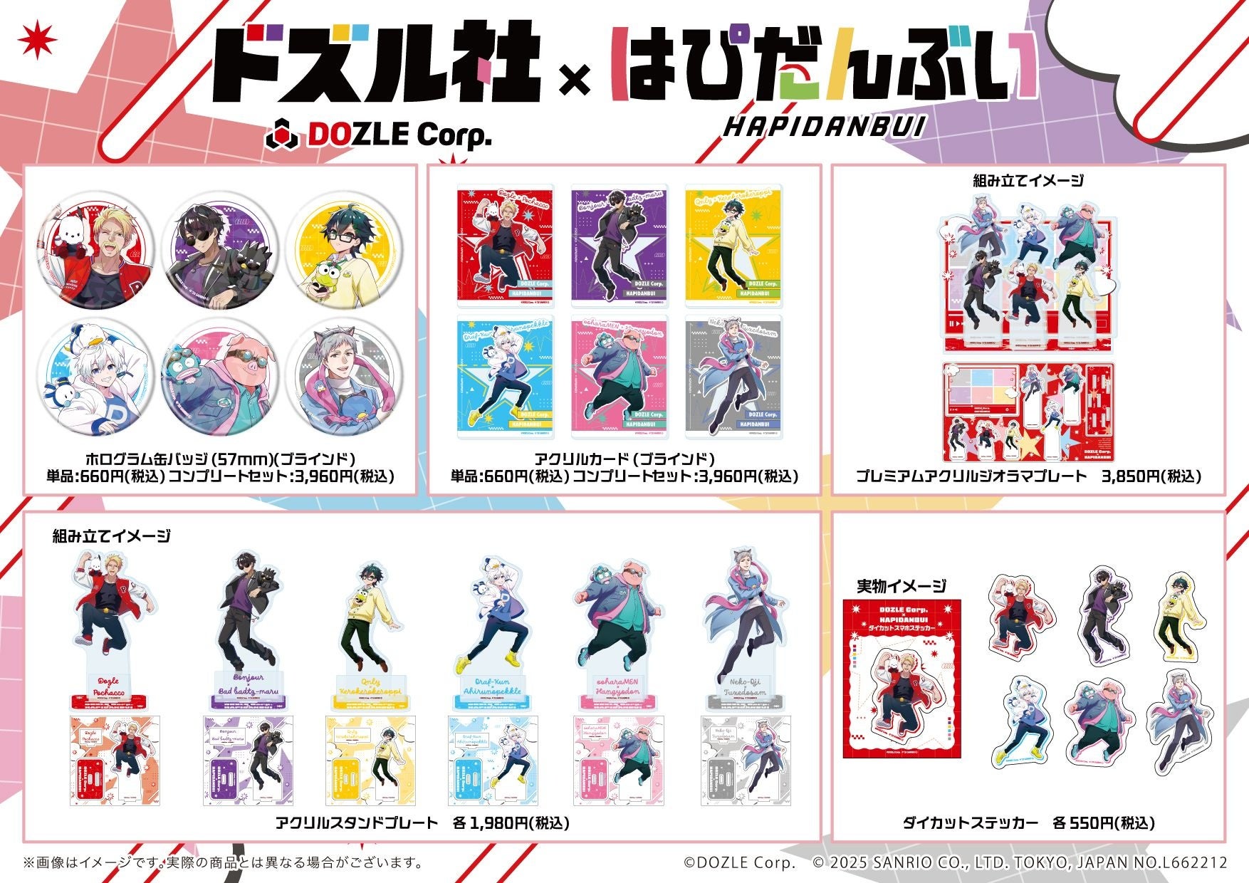 ゲーム実況グループ『ドズル社』と、はぴだんぶいがコラボレーション! コラボグッズが11月21日(金)から通販サイト「サンリオアニメストアONLINE」と、サンリオアニメストア池袋P’PARCO店で販売中です。