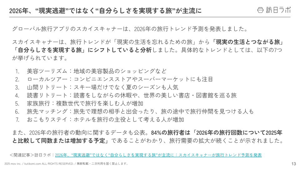 - 2026年、“現実逃避”ではなく“自分らしさを実現する旅”が主流に:スカイスキャナーが旅行トレンド予測を発表