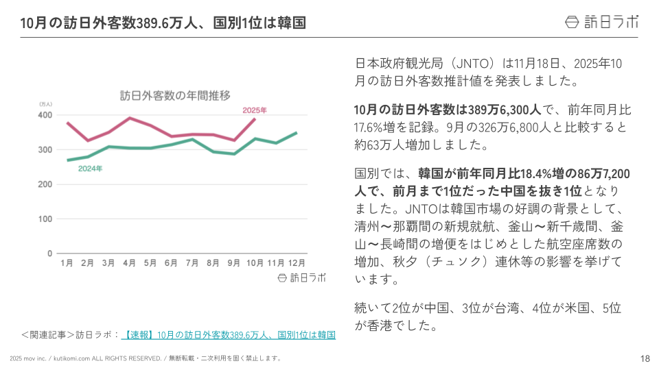 業界最大級のインバウンドビジネスメディア「訪日ラボ」及び 店舗向け集客一元化プラットフォーム「口コミコム」を運営する株式会社mov(代表取締役:渡邊 誠、本社:東京都渋谷区、以下mov)は、「インバウンドに関する最新トレンド・データ」「政府・自治体・企業などのインバウンド関連の取り組み」をはじめ、インバウンド対策に役立つニュースをまとめた「インバウンド情報まとめ【2025年11月後編】」を公開しました。