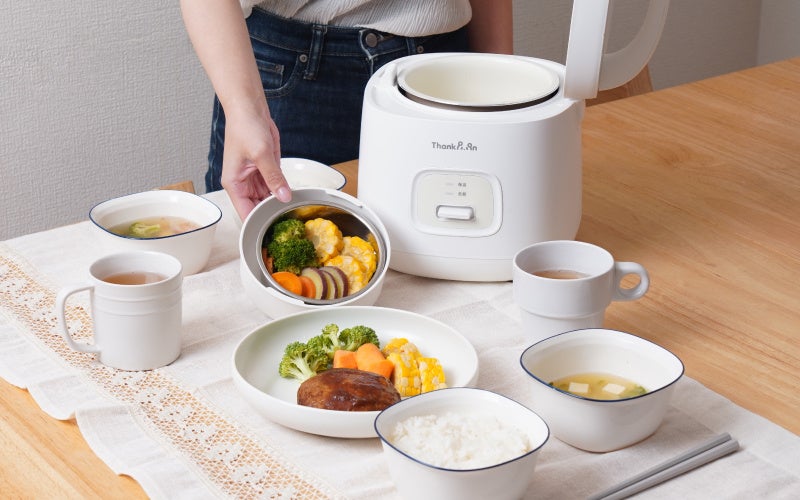 さらに付属の蒸しトレイを使えば、ご飯(1~2合)を炊きながら、上段で温野菜などの蒸し料理を同時に作ることができます。