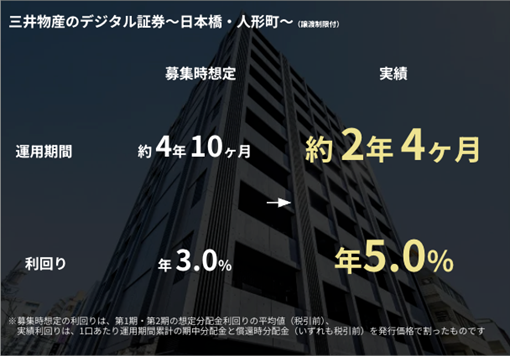 三井物産デジタル・アセットマネジメント株式会社(以下「当社」)は、当社が運用するデジタル証券ファンド「三井物産のデジタル証券~日本橋・人形町~(譲渡制限付)(*1)」を早期償還し、最終期決算を公開しました。不動産等売却益(キャピタルゲイン)が発生し、当初の想定を上回る投資成果となりました。