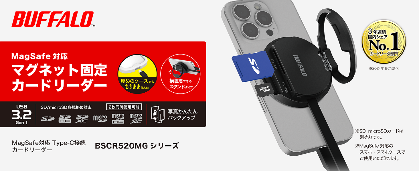 株式会社バッファロー(本社:東京都千代田区、代表取締役 社長執行役員CEO:牧 寛之)は、MagSafe対応でスマートフォンに磁力でピタッとくっつけることができ、持ち運びに便利なカードリーダー「BSCR520MGシリーズ」を2025年12月下旬より順次出荷いたします。