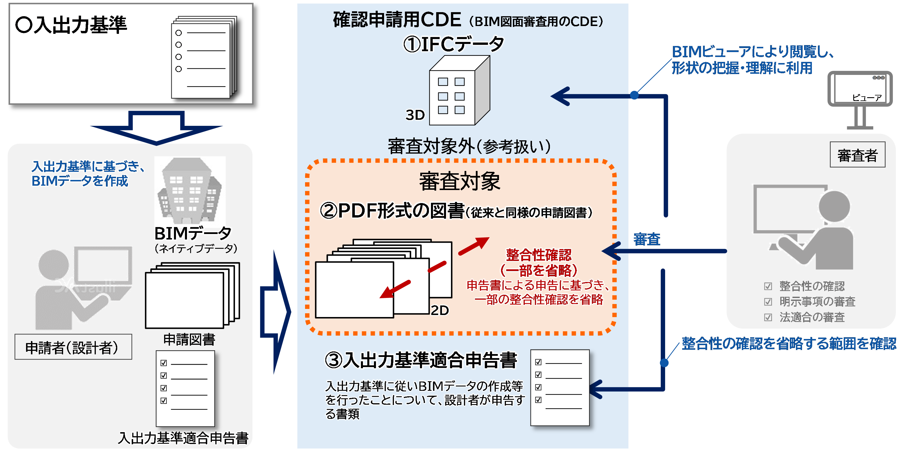 このため、確認申請用CDEによる設計者とのコミュニケーション精度の向上、IFC形式のBIMデータ(3Dモデル)による設計内容の視覚的理解の促進が期待されます。さらに、BIMデータの作成基準である「入出力基準」に従い作成された申請図書(PDF)を用いることにより、「申告書」に基づく項目について、整合性の確認を一部省略できます。