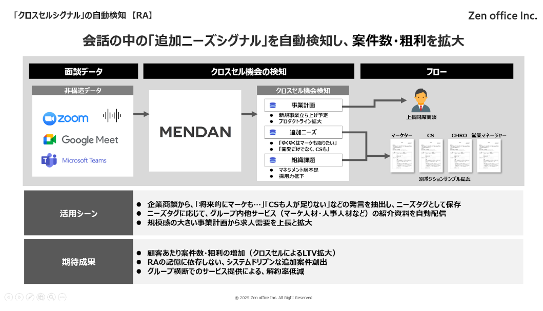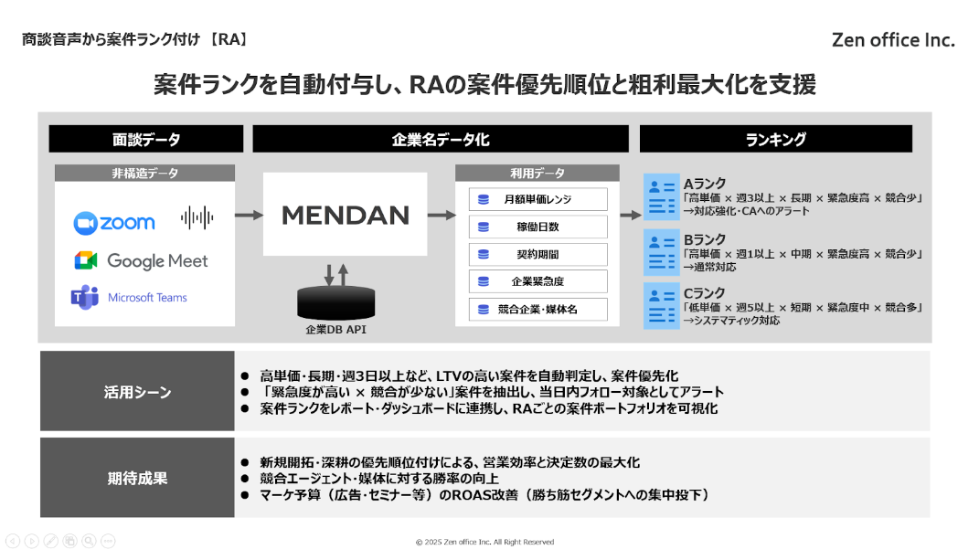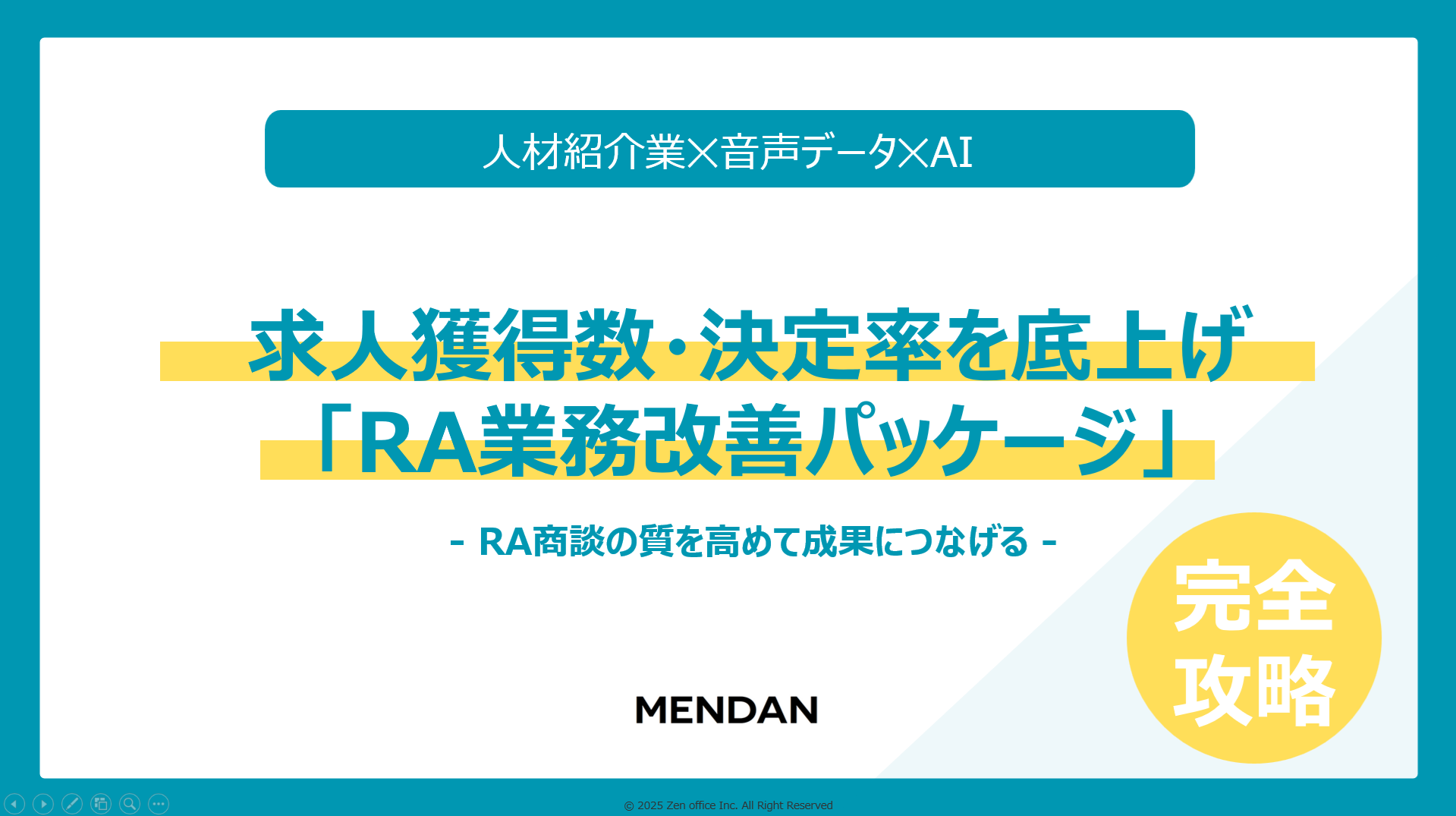 人材紹介会社向けに音声×AIによる決定プロセス変革支援サービス「MENDAN」を提供するZen office株式会社(本社:大阪府大阪市、代表取締役:岩瀬 恭裕、以下「当社」)は、RA(リクルーティングアドバイザー)業務に特化した新プラン「MENDAN RA業務改善」の本格提供を開始いたしました。