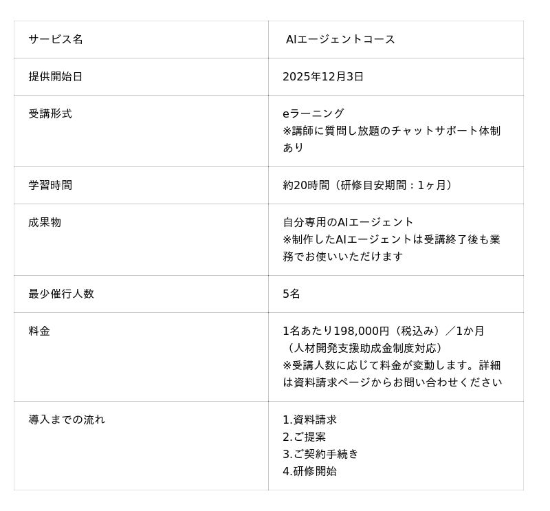 当社は、ITエンジニアでなくとも現場の従業員が自らの手で「AIエージェント」を構築・改修できることが、企業の生産性を向上させると考え、本コースの提供に至りました。