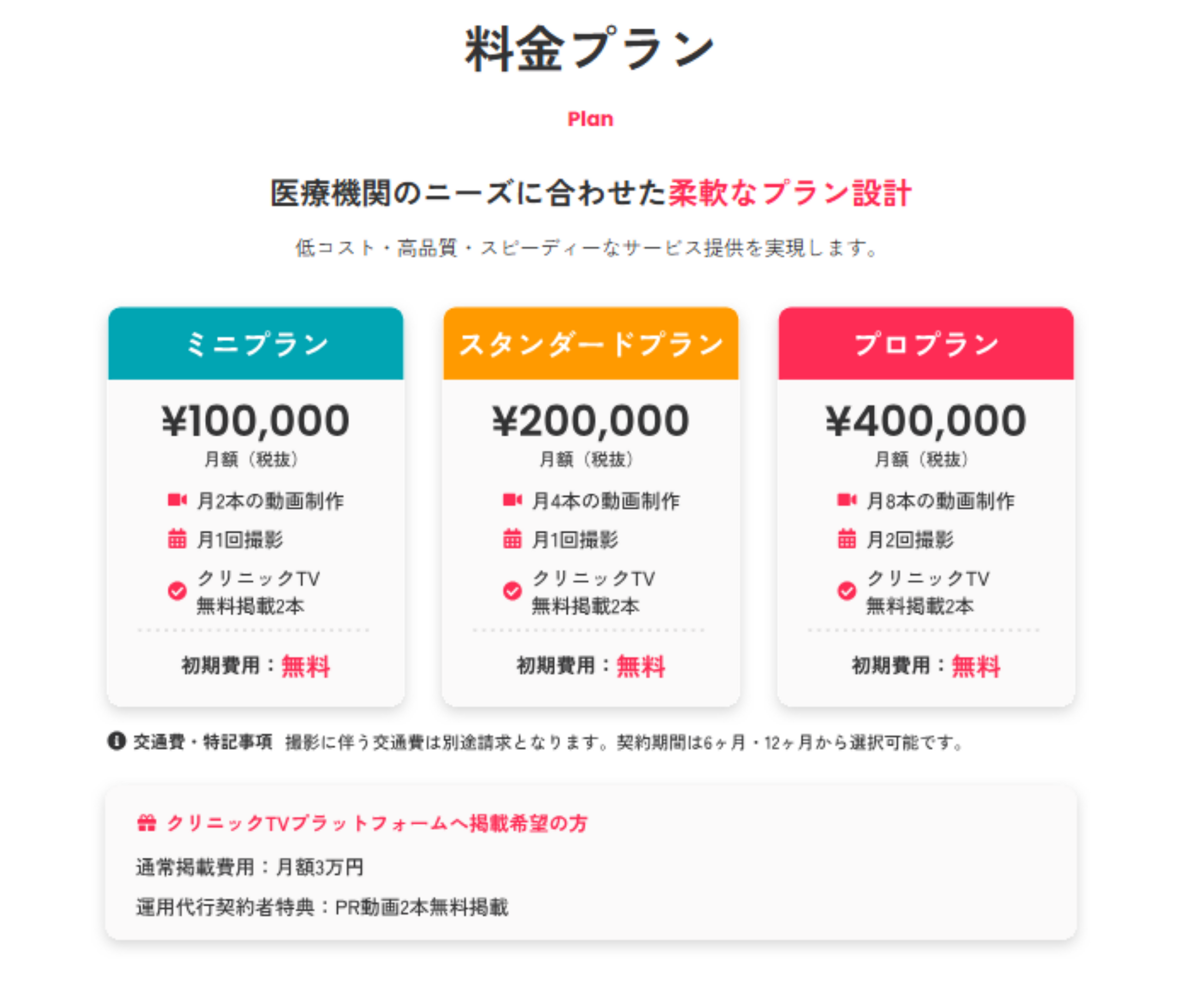 - クリニックTVメディアに掲載運営する医療専門の動画メディア「クリニックTV」に、制作した動画を無料で掲載し、地域の患者・求職者へのリーチ拡大に貢献します。