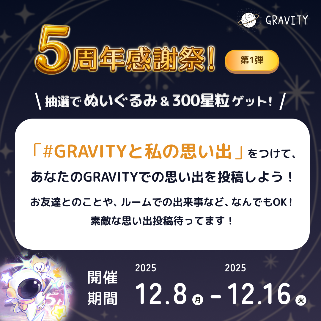 【総額10万円以上!】やさしいSNS「GRAVITY」おかげさまで5周年!支えてくださったユーザーの皆様への還元イベントを豪華5弾開催!!