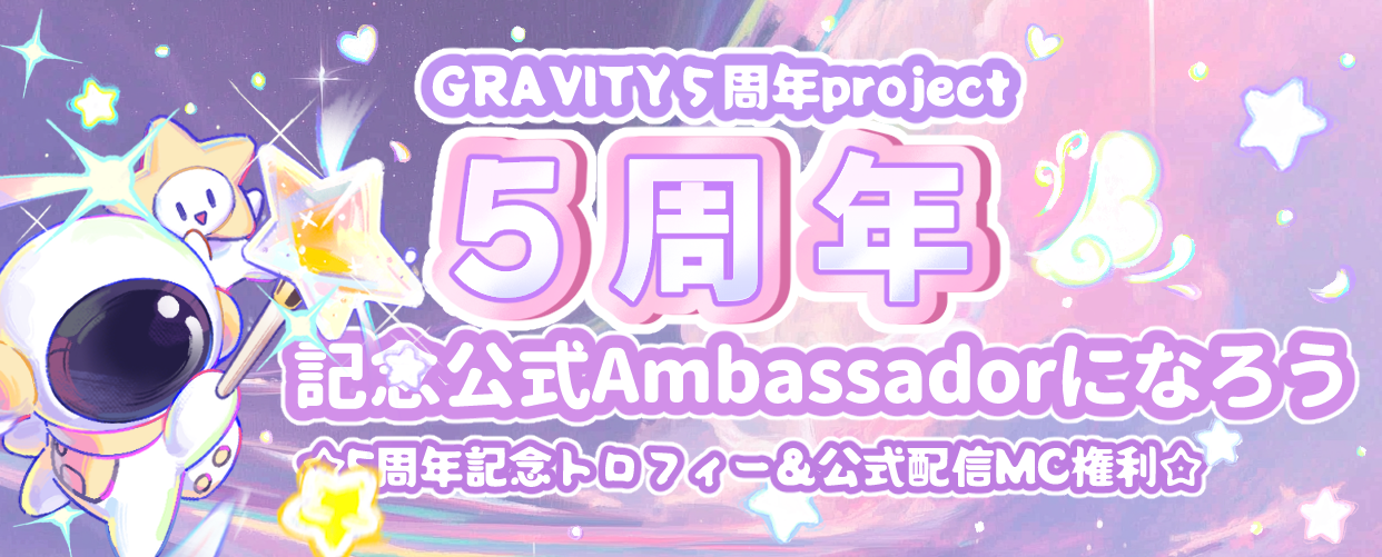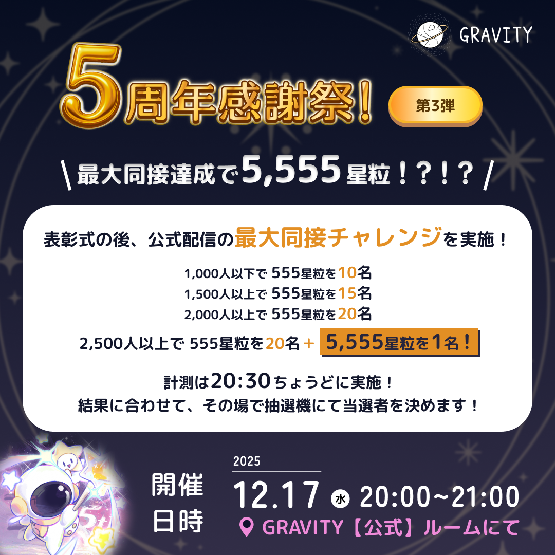 5周年を記念して、今年一年間GRAVITYにて大きく貢献してくれたユーザーを音声ルームで表彰いたします!各部門1,555星粒を3名ずつ、さらに5周年の特別フレームと吹き出し、表彰画像を作成いたします。表彰後にはみんなで同接2,500人以上を目指すお祭りチャレンジ!