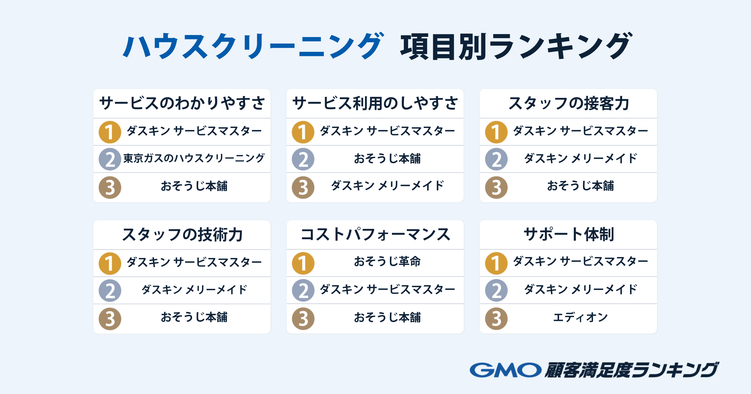 項目別ランキングでは、「サービスのわかりやすさ」「サービスの利用のしやすさ」「スタッフの接客力」「スタッフの技術力」「サポート体制」の5項目でダスキン サービスマスターが1位を獲得しました。また、「コストパフォーマンス」ではおそうじ革命が1位に輝きました。