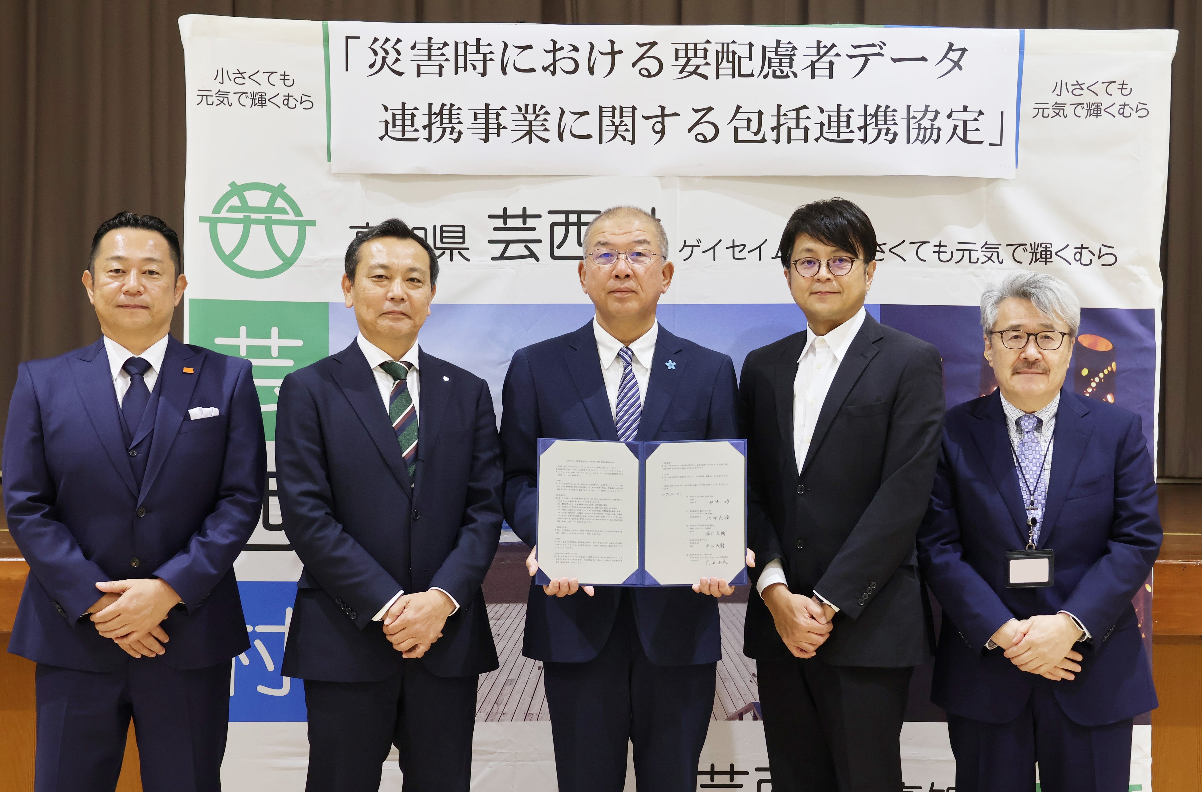 キヤノンマーケティングジャパングループのキヤノンビズアテンダ株式会社(代表取締役社長:杉中美勝、以下キヤノンBA)は、高知県芸西村(村長:松本巧)、医療法人おくら会 芸西病院(理事長:藤戸良輔)、高知県立大学(学長:甲田茂樹)、イツモスマイルデジタルソリューションズ株式会社(代表取締役:大田仁大、以下イツモDS)とともに、2025年12月3日、「災害時における要配慮者データ連携事業に関する包括連携協定」を締結しました。本協定により、災害時の避難支援が必要な災害要配慮者※1(以下要配慮者)の生活・医療情報などを共有できる仕組みを構築し、迅速な避難支援を可能にする実証事業を開始します。