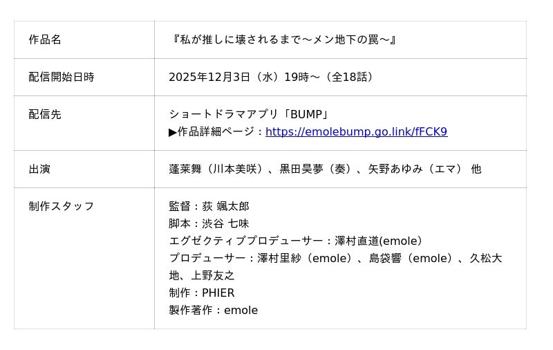 ショートドラマアプリ「BUMP」を運営するemole株式会社(本社:東京都目目黒区、代表取締役:澤村直道)は、BUMPオリジナルショートドラマ『私が推しに壊されるまで~メン地下の罠~』を2025年12月3日(水)19時よりBUMPにて独占配信いたします。