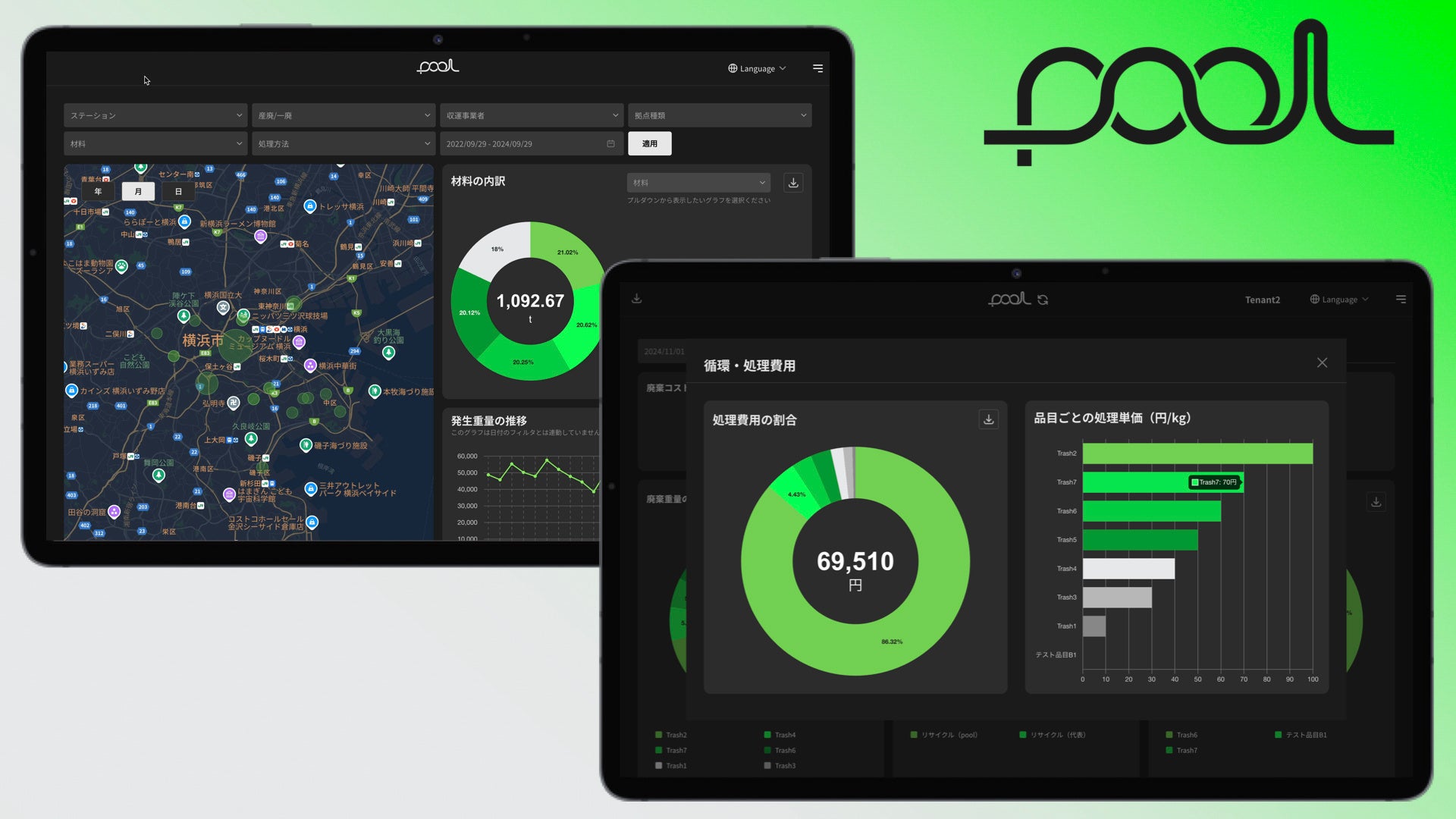 - - 廃棄物データの見える化:「pool」を活用し、排出される資源・廃棄物の量や種類を詳細に記録・分析し、リアルタイムなデータ管理を行います。