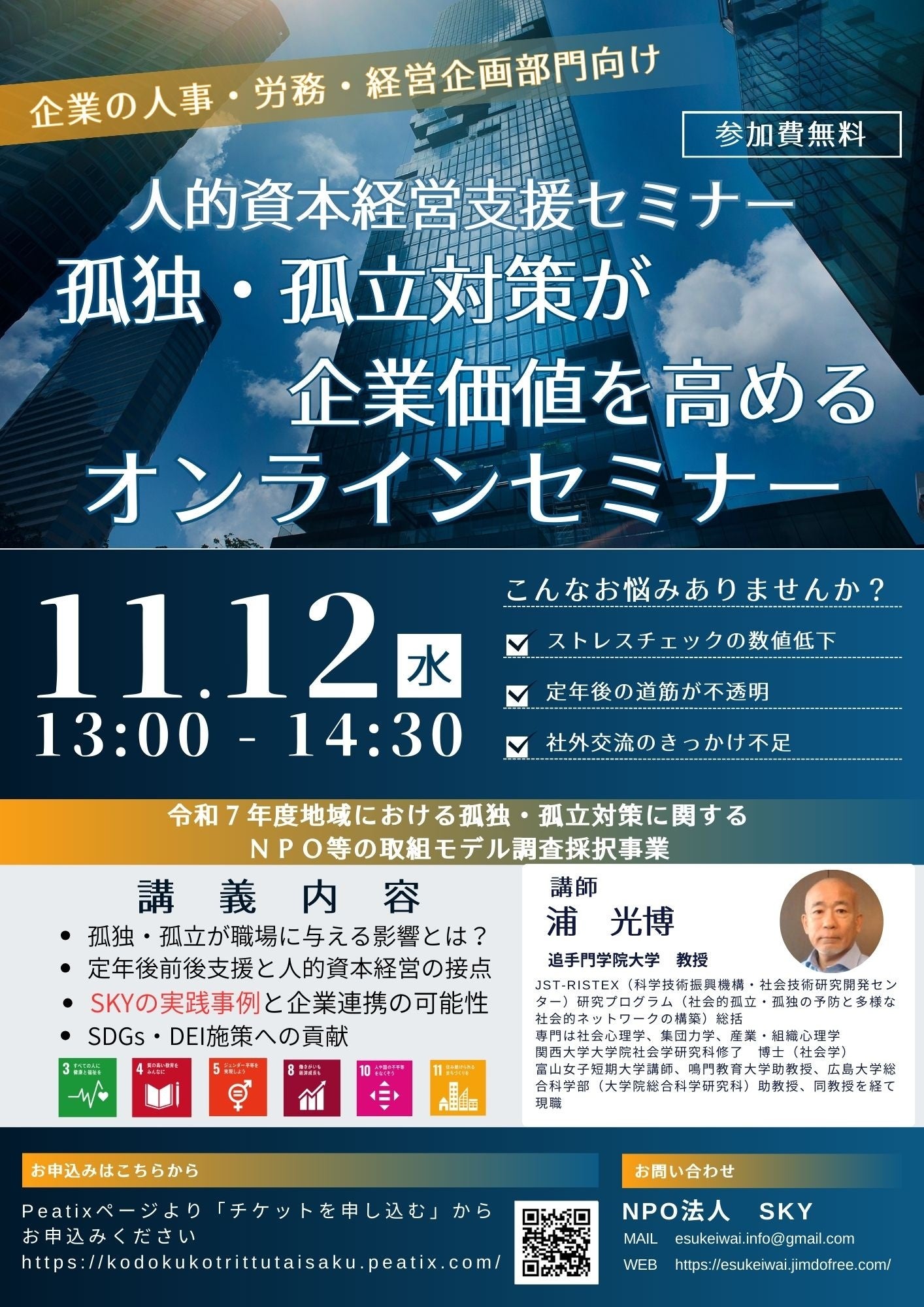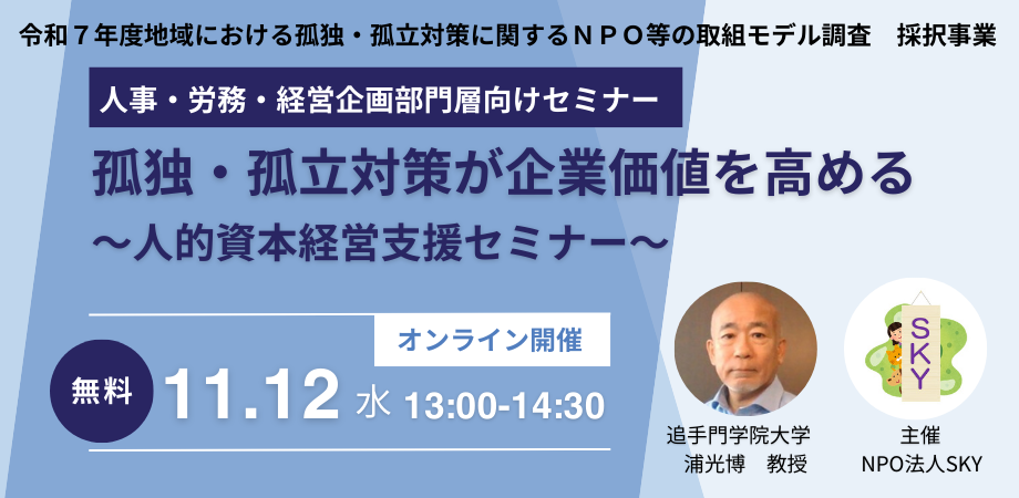 NPO法人SKY(所在地:大阪府大阪市)は、2025年11月12日、内閣府「地域における孤独・孤立対策に関するNPO等の取組モデル調査」の採択事業として無料のオンラインセミナーを開催、企業において経営や人事・労務に携わる方や地方自治体の方等36名の参加者を得て盛況のうちに終了いたしました。