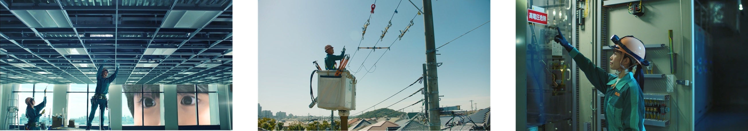 登場する技術者は全て当社の社員です。「人財力の強化」や「未来を担う人財の育成」を早くから掲げる当社だからこそ、社員一人ひとりの姿を丁寧に映し出し、未来を支える力強い存在として表現。社会インフラの根幹を支え、私たちの暮らしをより豊かで快適なものへと導いていることを、リアルに感じていただける内容となっています。