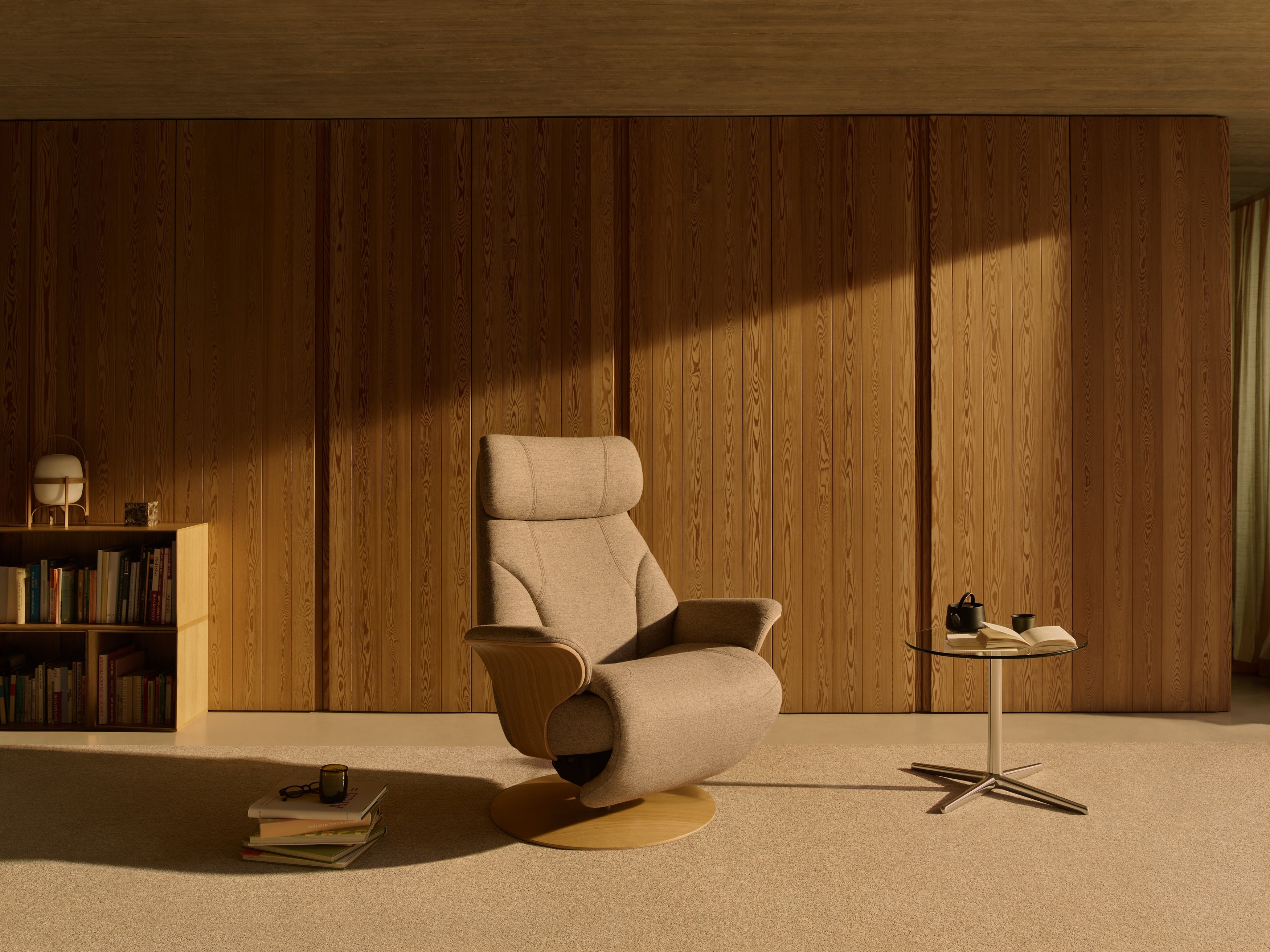 柔らかな曲線が美しいウッドパネルが空間の品格を高めます。ベースは木製ディスクまたは金属製シリウスから選択可能。北欧らしいミニマルで調和的なフォルムが、リビングを上質なラウンジへ格上げします。