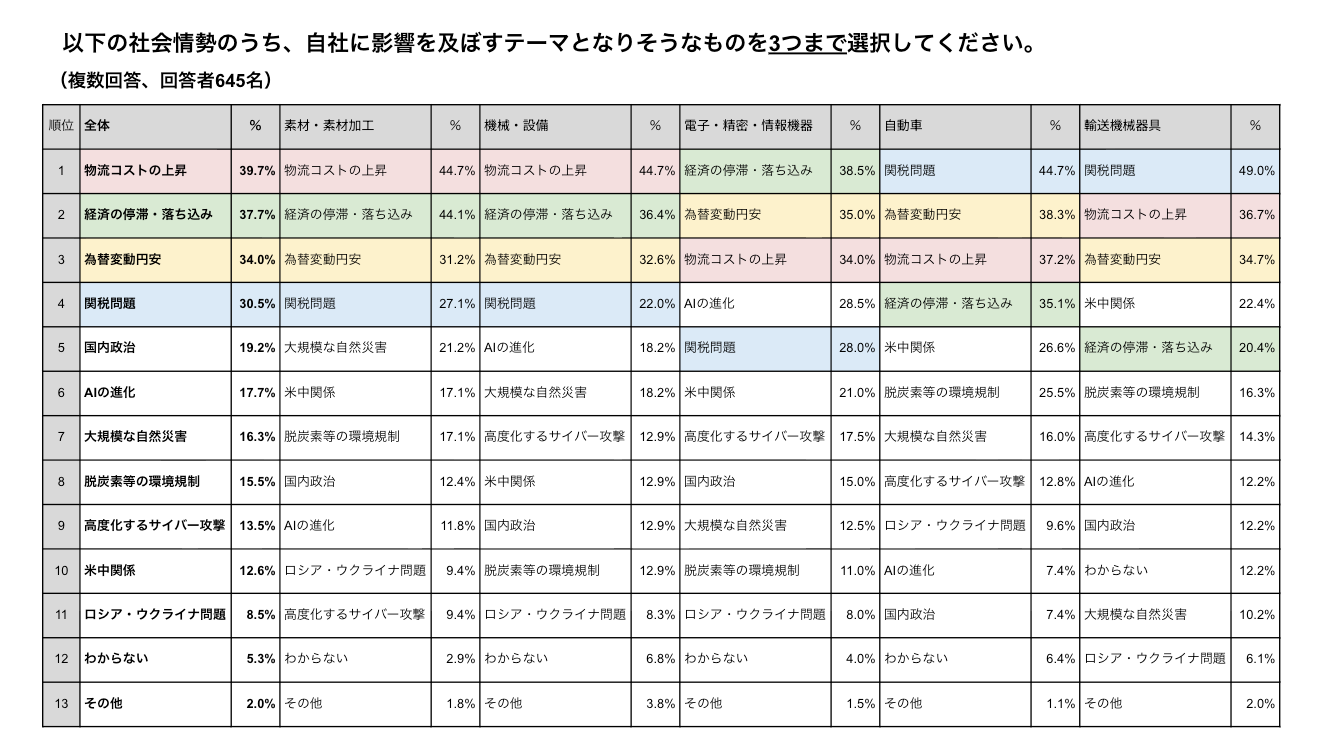 ● 全体では「物流コスト」が最大の懸念となり、一方で自動車業界は「関税」を警戒し、グローバルリスクへの感度の高さが浮き彫りとなりました。