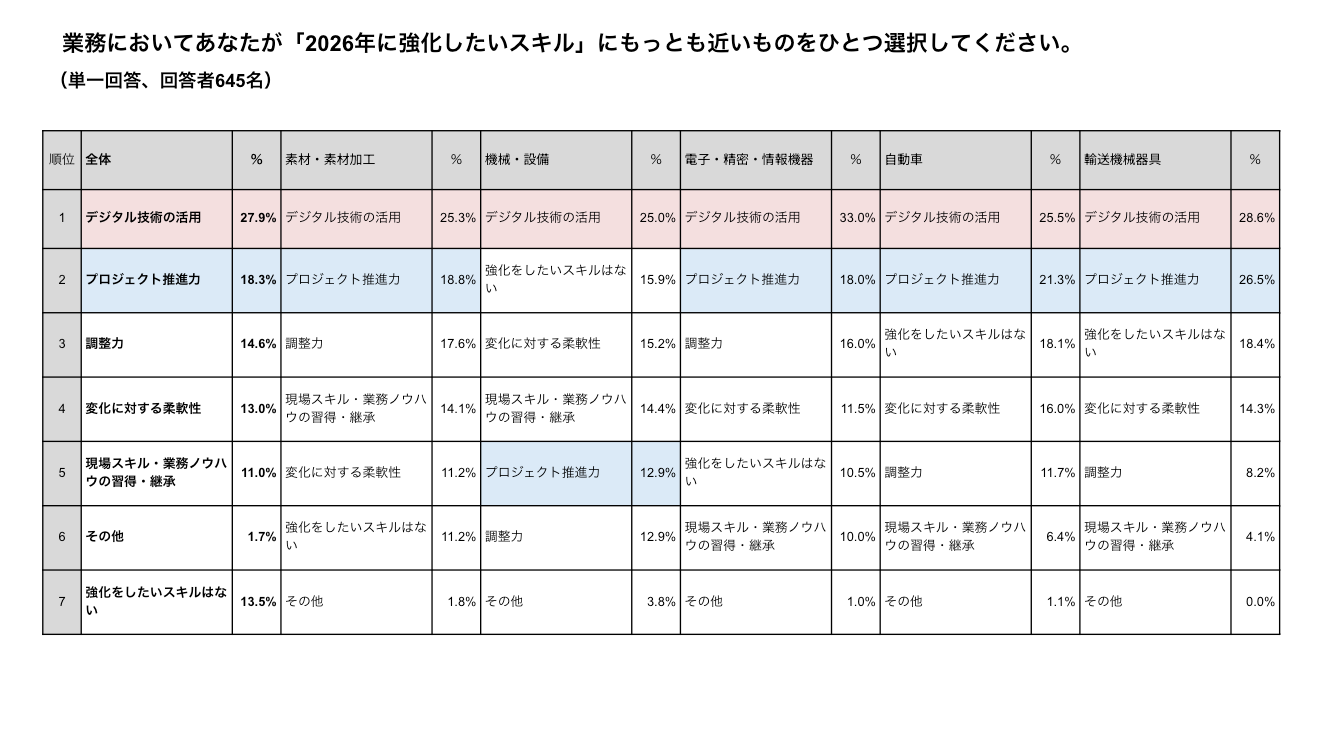 ・2026年に強化したいスキルでは、すべての業種で「デジタル技術の活用」が最多となり、約4人に1人がデジタルスキルの強化を志向していることがわかりました。