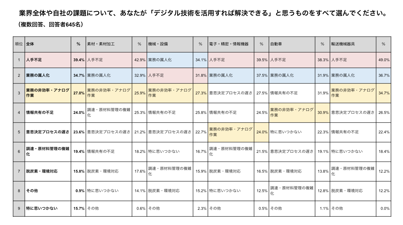 さらに、自動車や輸送機械器具といった大規模産業では「意思決定プロセス」が最大の課題として浮上しました。関係者や承認者が多い産業構造が影響しており、変化の速い市場に対応するためには、人手不足や属人化の解消に加えて、意思決定のスピードも競争力の源泉になりつつある実態が見えてきました。