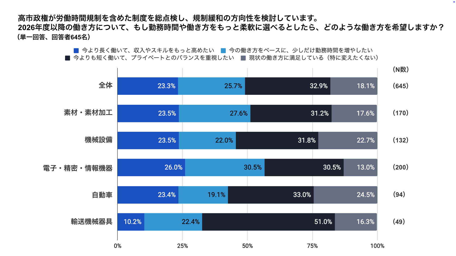 ● 労働時間規制について「今より長く働きたい」層が約半数。長く働く意欲を持つ層が一定存在する実態が明らかになりました。