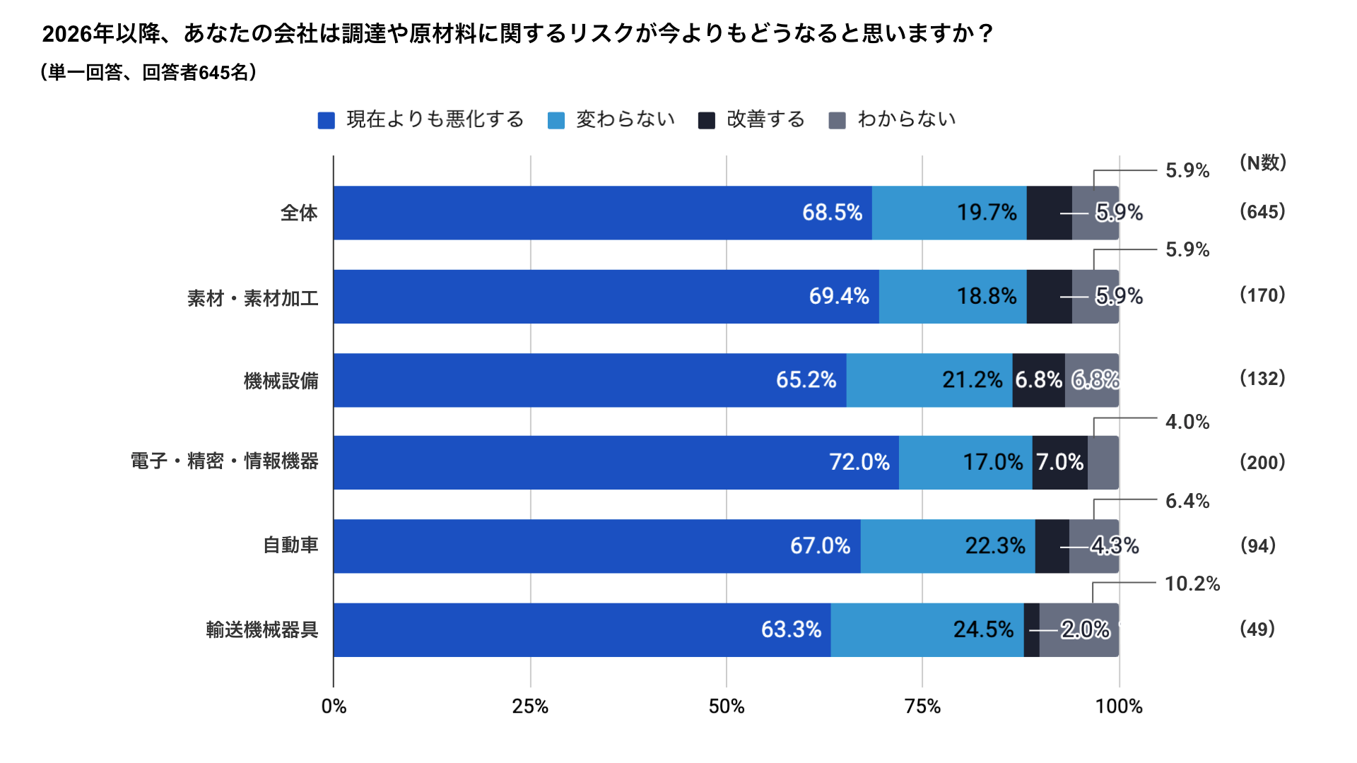 ・2026年以降の調達や原材料に関するリスクについて、全体の68.5%が「現在よりも悪化する」と回答しており、最も多い選択肢となりました。