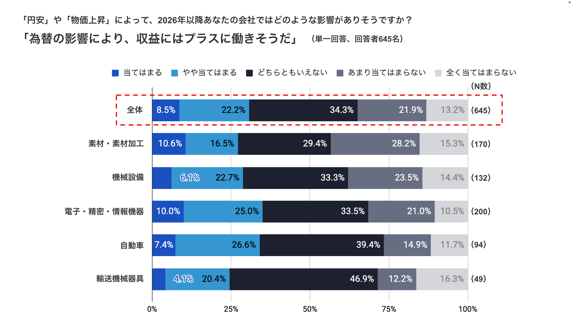 ・一方で、「為替の影響により収益にはプラスに働きそうだ」とした人は全体で30.7%にとどまり、最も多い電子・精密・情報機器でも35.0%と、プラス影響は相対的に限定的でした。これらより、円安・物価上昇による収益構造への影響は、業界全体としてプラスよりもマイナス側面が大きく捉えられていることが明らかになりました。