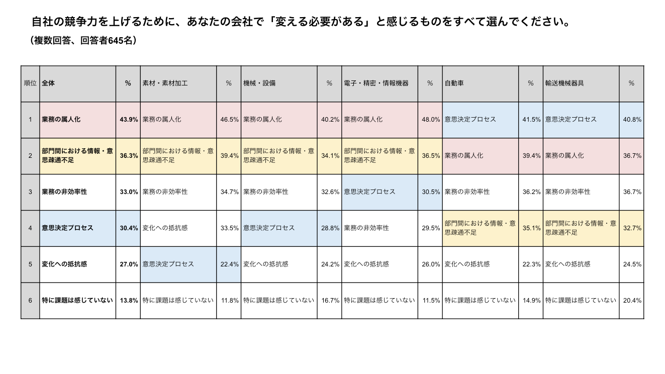 ・競争力強化のために自社の変えるべき点としては「業務の属人化(43.9%)」が全体トップ。一方で、自動車/輸送機械器具では「意思決定プロセス」が最大課題となるなど、産業構造による違いが見られました。