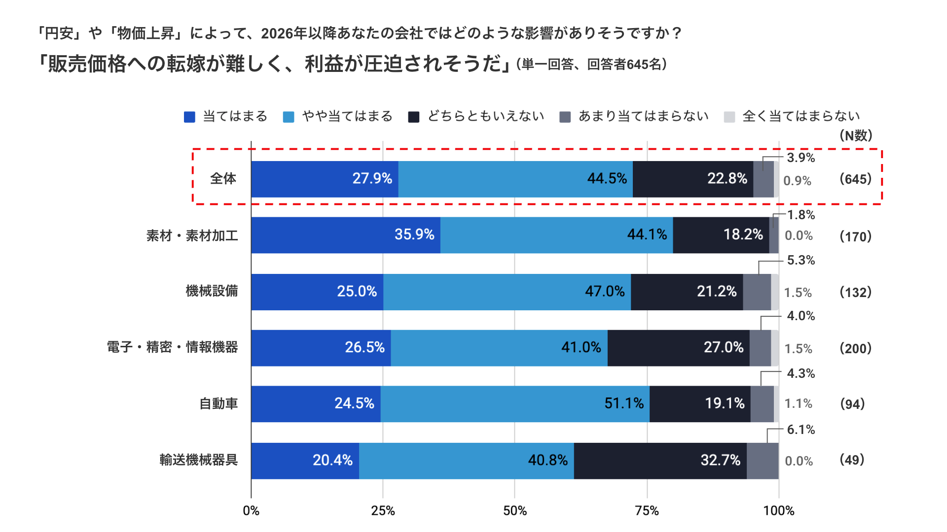 ・「円安」「物価上昇」の影響がもっとも高いのは「調達コスト増加(85.4%)(当てはまる+やや当てはまるの合計)」でした。続いて「販売価格への転嫁が難しく、利益が圧迫されそうだ(72.4%)」となり、円安・物価上昇による“利益マイナスの影響”が強く意識されていることがわかりました。