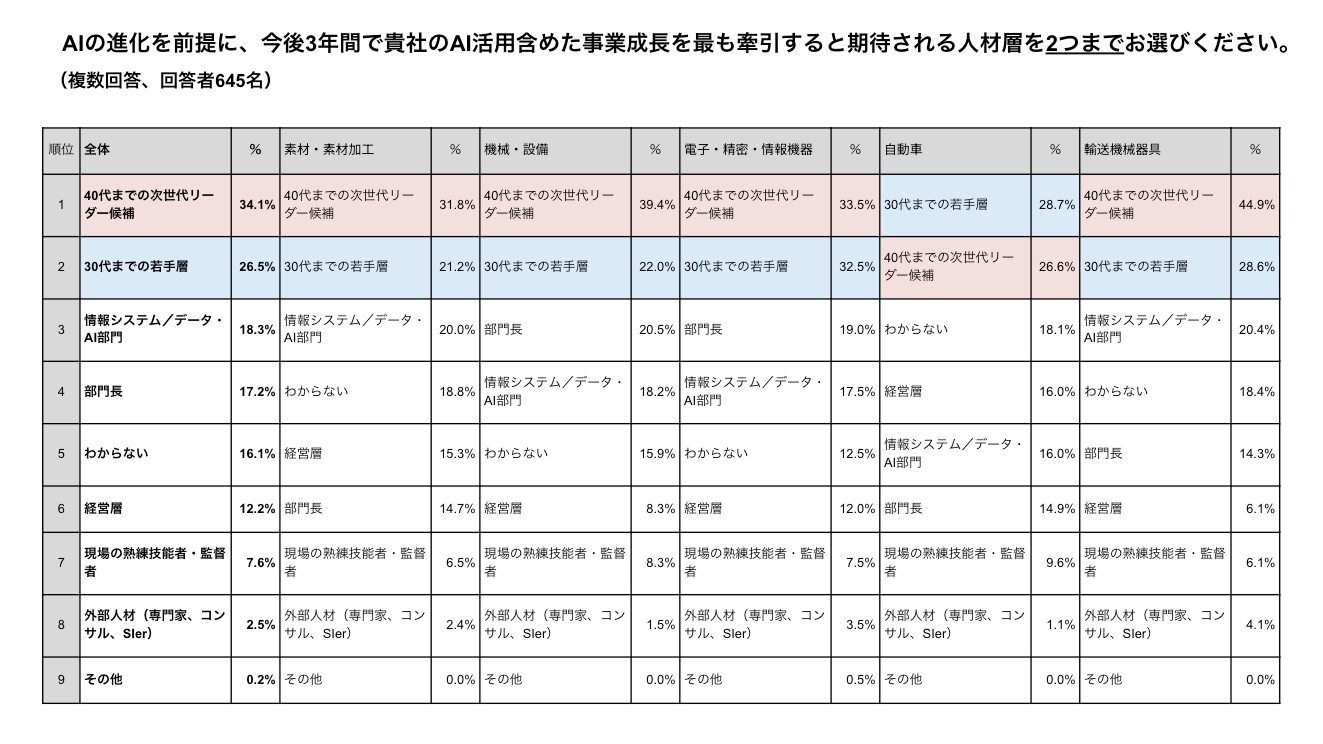 ● 今後3年でAI活用を含む事業成長を牽引する人材層として「40代までの次世代リーダー候補」「30代までの若手層」に期待が寄せられていることが明らかになりました。
