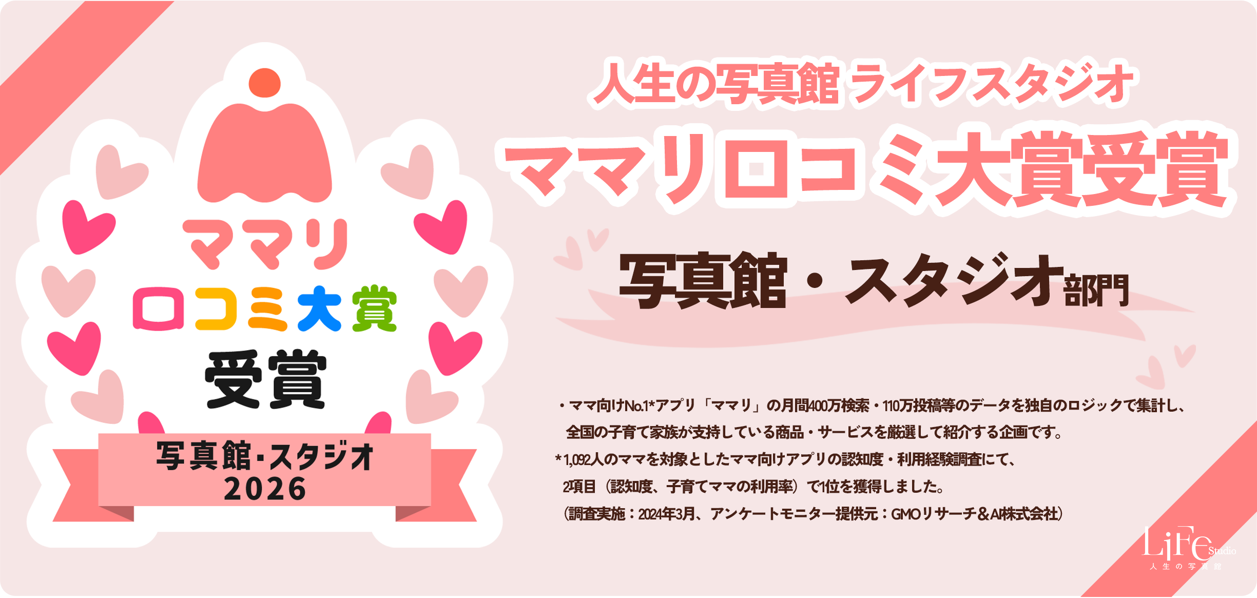 ライフスタジオは「ママリ口コミ大賞2026」の“写真館・スタジオ部門”にて受賞いたしました。ママ、パパを中心とした育児世代から圧倒的な支持を受け、多くの口コミと実績によって選出された安心と信頼の証です