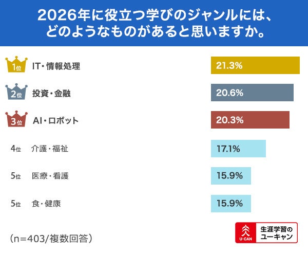2026年、役立ちそうな学びのジャンルTOP3に「IT・情報処理」「投資・金融」「AI・ロボット」