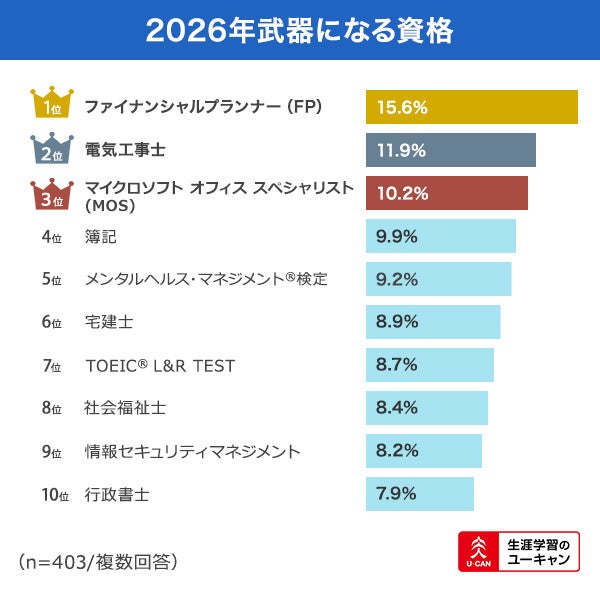 「2026年に取っておくと武器になると思う資格は何だと思いますか」と質問したところ、1位「ファイナンシャルプランナー(FP)」(15.6%)、2位「電気工事士」(11.9%)、3位「マイクロソフト オフィス スペシャリスト(MOS)」(10.2%)という結果になりました。