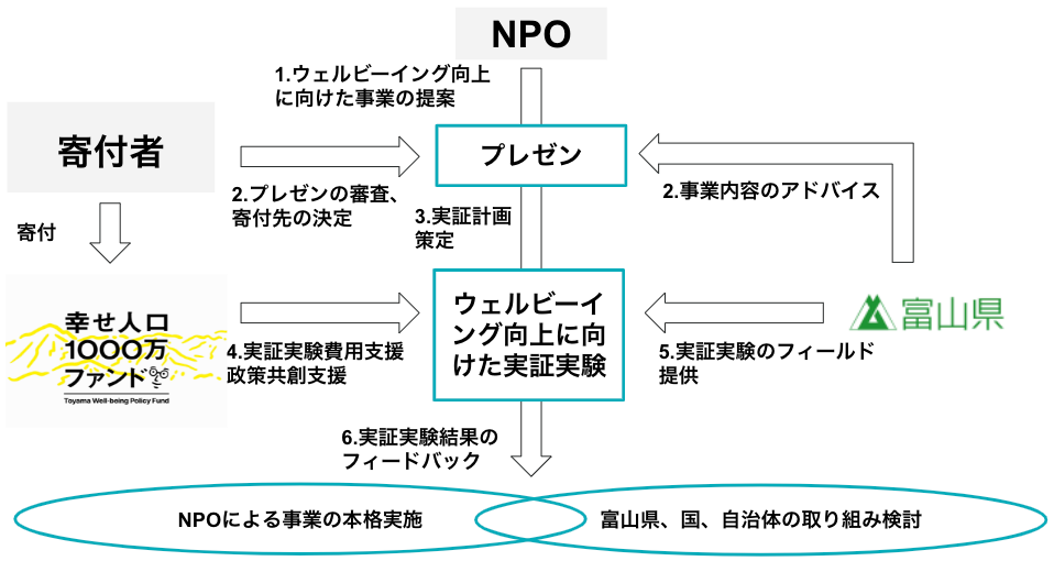 富山県は、2022年に全国に先駆けてウェルビーイングを核とする成長戦略を策定し、戦略のビジョンとして「幸せ人口1000万~ウェルビーイング先進地域、富山」を掲げています。本ファンドは、富山県民のウェルビーイングを向上させることを目的とし、非営利団体等による富山県をフィールドとした実証実験を経て、新しい取組の実現を目指します。